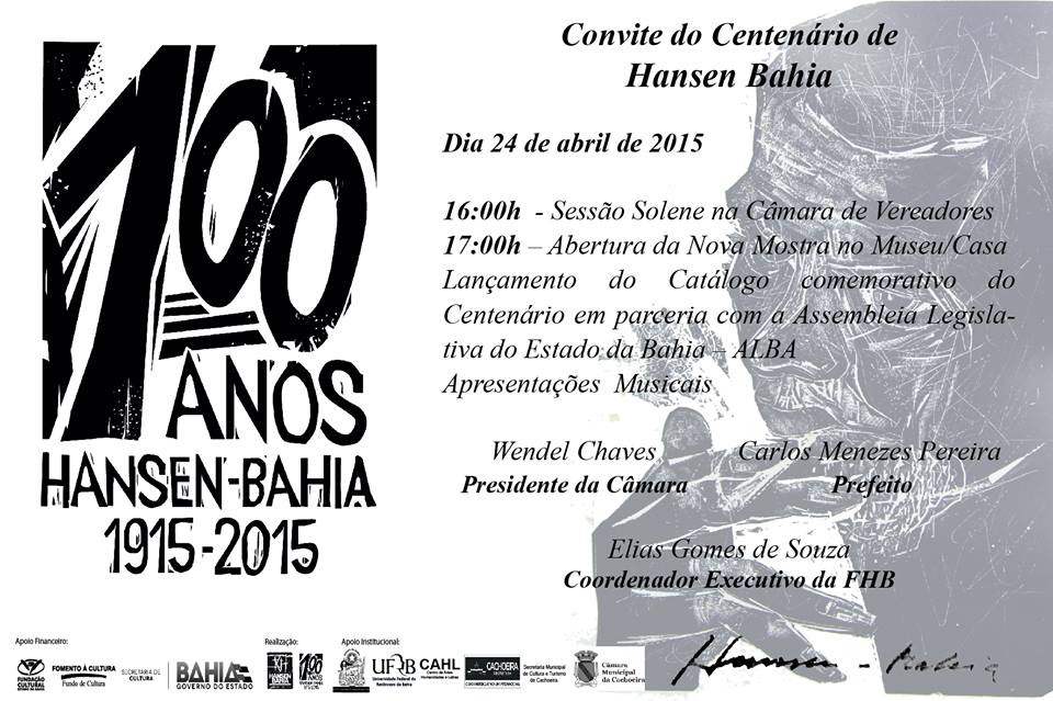 A programação comemorativa contempla sessão solene na Câmara de Vereadores de Cachoeira; abertura de uma nova mostra e lançamento da publicação “100 anos Hansen- Bahia, 1915-2015” - em parceria com Assembleia Legislativa do Estado da Bahia – ALBA; exposição no Museu Casa Hansen Bahia, em São Félix; além de oficinas de gravura, continuadas e gratuitas na Fundação Hansen Bahia.