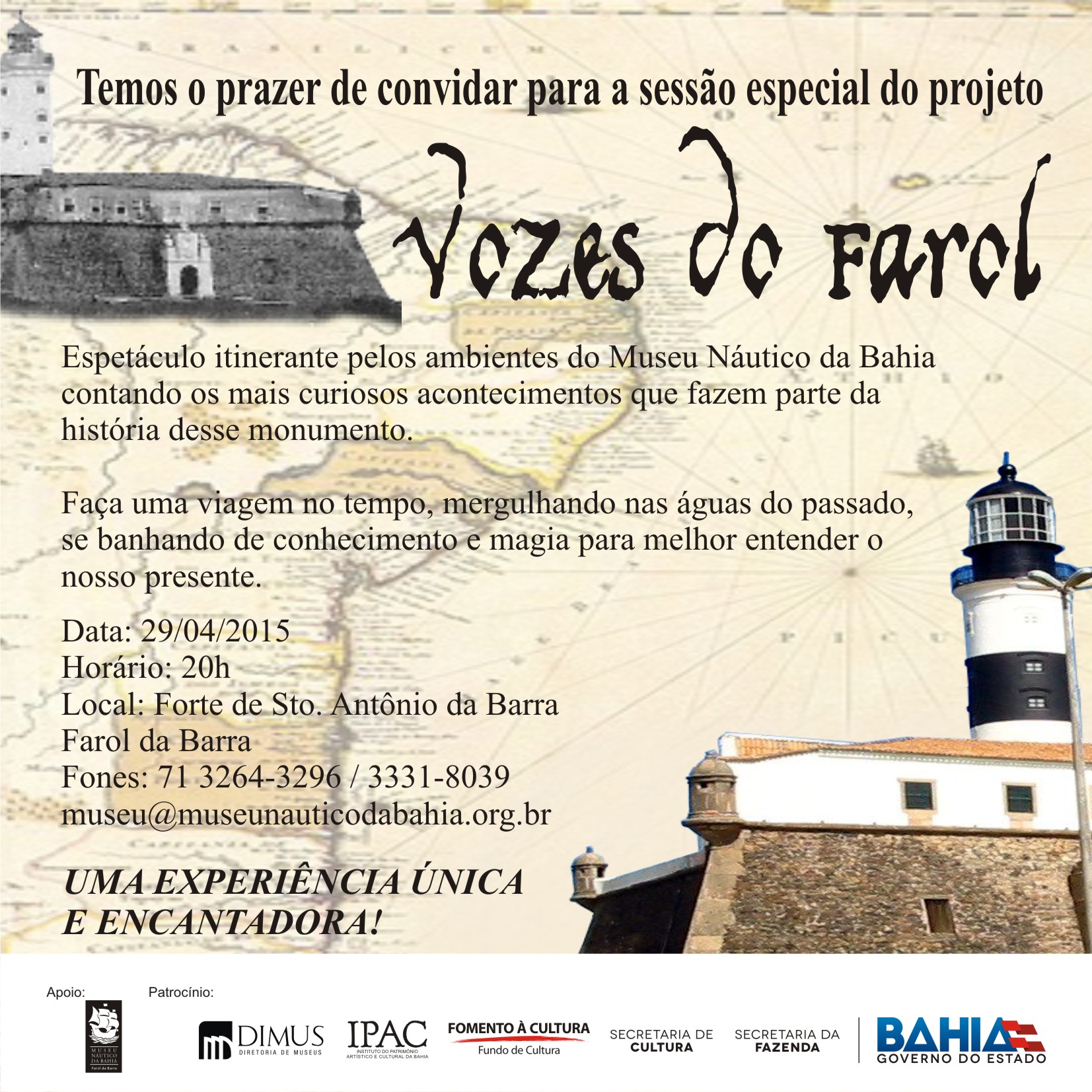 Trata-se de uma intervenção Artística, dramatizada por atores profissionais, de acesso gratuito à população, apresentando, através de histórias encenadas in loco, o Museu (o seu prédio e a existência do seu acervo), a sua História e a importância de cuidar e preservar o Mar da Bahia. O Texto, escrito especialmente para ser encenado no local, aborda a história e o acervo do Museu Náutico da Bahia, traz alguns personagens ligados à realidade de outros tempos do Forte Santo Antônio da Barra. O Faroleiro e sua filha, o militar, o escravo, a recepcionista, a museóloga e o próprio mar, são os personagens lúdicos que vêm contar esta história, enriquecendo através de uma ação educativa, a aprendizagem do visitante sobre o local, além da visitação ao seu acervo e à Fortaleza. Os atores guiarão os visitantes, fazendo sempre um pequeno resumo de cada tema abordado em cada sala de exposição. O projeto objetiva despertar o interesse do visitante (focando o público estudantil principalmente) pela cultura local, mostrando a história da nossa terra de forma lúdica e educativa, popularizando e divulgando o Museu Náutico da Bahia, contribuindo para a formação da Memória e Identidade do nosso jovem. Equipe: Direção: Aicha Marques Texto e Produção Executiva: Caíca Alves Elenco: Pedro Müller, Mirella Matteo e Wendel Damasceno. Proponente, Pesquisa e Produção Operacional: Morgana Dávila Assistente de Produção: Viviane Jacó Músicos: Jéferson e Érica Apoio: Museu Náutico da Bahia ( e equipe), Segilight - Luz e Eventos. Patrocínio: DIMUS, IPAC, Fomento à Cultura, Secretaria da Cultura, Secretaria da Fazenda, Governo do Estado da Bahia. MAIORES INFORMAÇÕES sobre o projeto e o evento do dia 29: Rita Andrade (Museóloga responsável do Museu Náutico da Bahia) museologia@museunauticodabahia.org.br tels: (71)3331 8039 (71)3264 3296 (71)8835 5360 (71)9123 9311 Caíca Alves caicalves@yahoo.com.br tel: (71)9198 4708 Morgana Dávila morgana.davila@gmail.com Museóloga - COREM 1R 0310-I Atriz/ Artista - DRT 2056 tels:(71) 9302 0289 Tim (71) 8766 0287 Oi (71) 9943 8814 Vivo Aicha Marques aichamarques@hotmail.com tel: (71)9283 8973