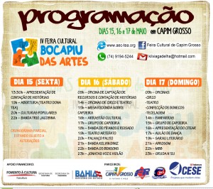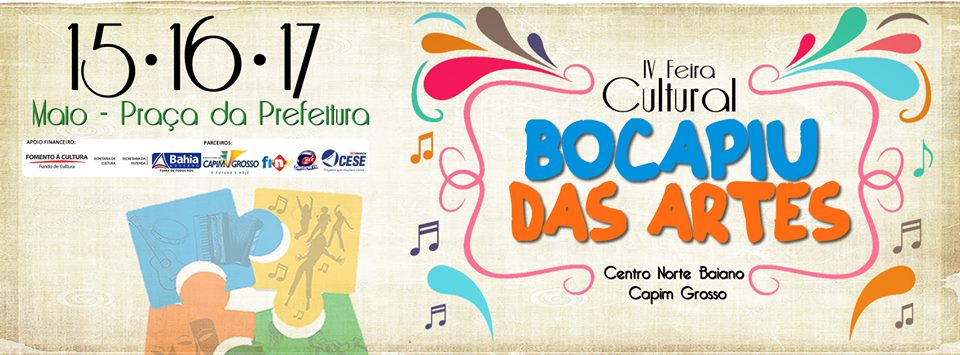A AEC-TEA, Associação Educação e Cultura, realiza entre os dias 15 e 17 de maio, a IV Feira de Cultura Bocapiu das Artes do Centro Norte da Bahia, no município de Capim Grosso. O evento reúne artistas de diversas expressões culturais, tais como, as culturas tradicionais: piegas e samba de roda, comércio de produtos artesanais, caminhada cultural, shows musicais, comidas típicas e outros serviços.