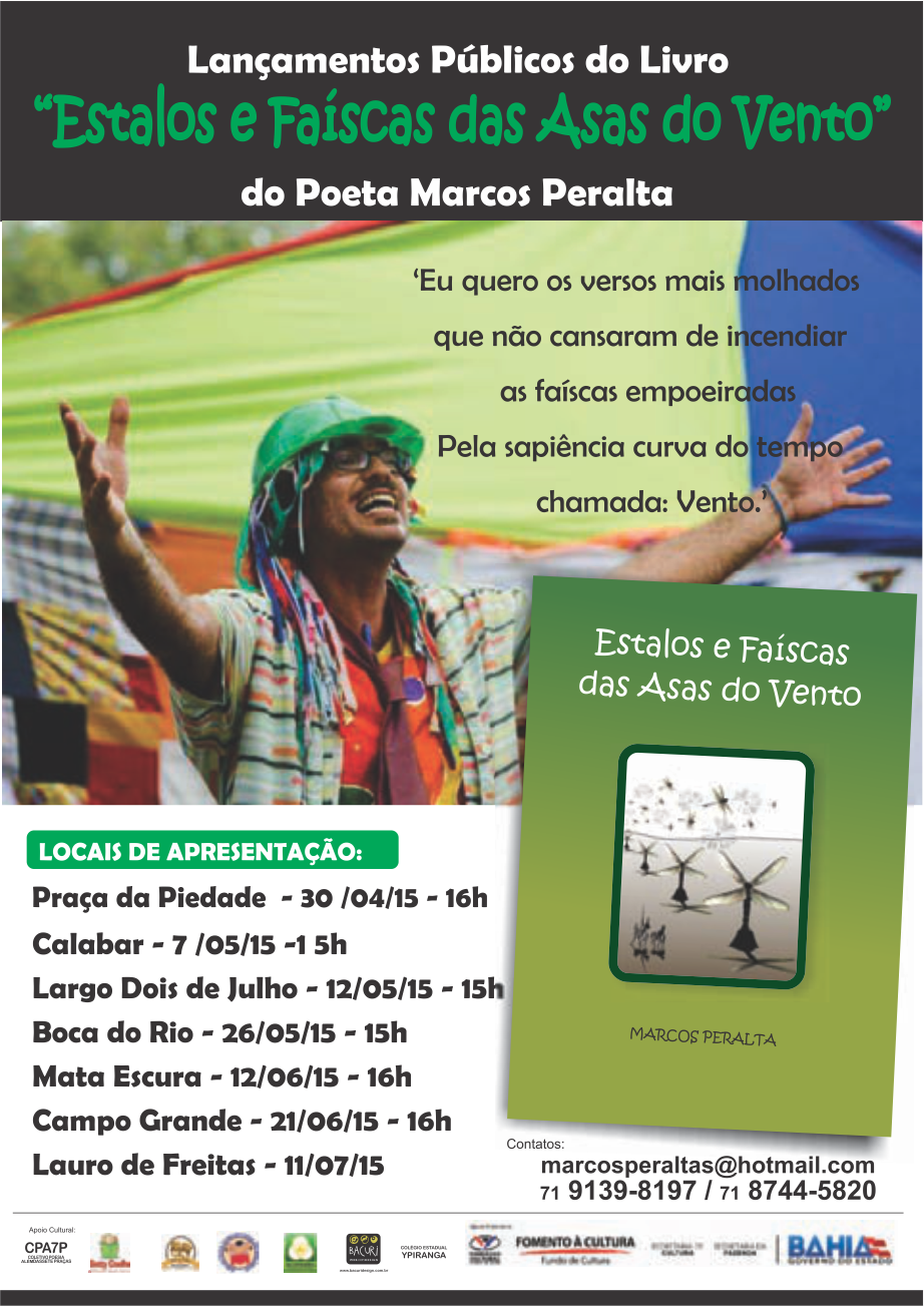 Contagem regressiva para o Lançamento do livro "Estalos e Faíscas das Asas do Vento", do poeta Marcos Peralta, dia 30 de abril, às 16h na Praça Piedade. O lançamento, aberto ao público, acontece durante a realização da 9ª Edição da retomada da Praça Nacional da Poesia: A Piedade - Sarau - Além das Sete Praças promovido pelo Coletivo Poesia. Além das Sete Praças, contará com participação da Conexão Estalos e Faíscas, do grupo musical Som De Cumbia e dos poetas Walter César, Semírames Sé, Luciana Estrela e Tiago Gato Preto, Simone Sento Sé, dentre outros trovadores.