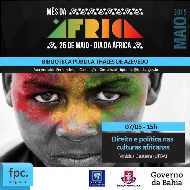 A programação começa na quinta, dia 7, com o a palestra do historiador Vinícius Lins, que falará do tema “Direito e política nas culturas africanas", às 15h, na Biblioteca Pública Thales de Azevedo (Costa Azul). Nos dias 18 e 25, às 14h, a biblioteca receberá o historiador, Alex França, que continuará suas aulas sobre Literatura e Cinema Afro-Latino Americanos. No 18 de maio, a aula, que terá como tema com o“Literaturas Africanas de Línguas Portuguesa: a produção moçambicana” e a do dia 25 terá como tema “Literatura negro-brasileira contemporânea: ditos e não ditos”, uma discussão de textos que priorizam a problemática étnico-racial.