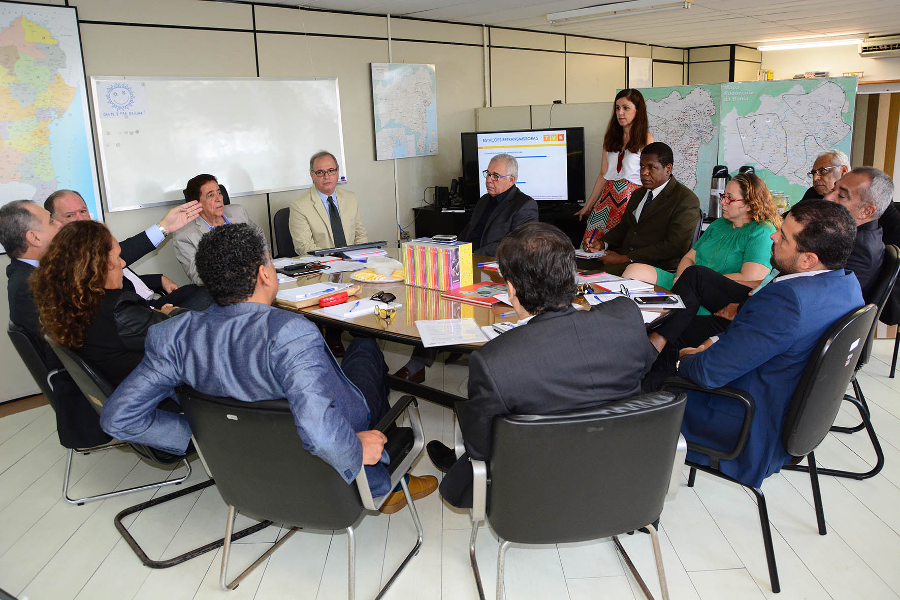 A sessão, que se iniciou às 9h, teve como pauta a apresentação do secretário da Educação Osvaldo Barreto como presidente do Conselho, e a solicitação da inclusão da Secretaria de Comunicação no enclave. Foram pautas também as novas metas e as ações do IRDEB e a aprovação do calendário de reuniões para 2015. Para o secretário de Educação, Osvaldo Barreto, a reunião foi histórica, pois decisões de cunho estratégico foram tomadas para viabilizar algumas diretrizes, entre elas, uma ação junto ao Ministério das Comunicações para resolver os problemas das outorgas da TVE, e o processo de ativação do sinal digital nas várias regiões da Bahia. A previsão é de que pelo menos 50% da população baiana possa assistir a TVE HD ainda esse ano. “Iremos trabalhar para isso, é um desafio que está colocado para o IRDEB, que irá começar trabalhar nessa direção”, disse o secretário da Educação. Canal da Cidadania O Canal da Cidadania também foi tema da reunião e, destacado pelo secretário Osvaldo Barreto, que anunciou o início de um processo de articulação entre as várias secretarias para que este segundo canal, já autorizado pelo Ministério das Comunicações, seja um instrumento de ampliação da comunicação do governo com a população, na exibição de atos, serviços, informações de interesse público, educacionais e culturais, e inclusive para ser veiculado nos equipamentos como o SAC, rodoviárias, hospitais, clínicas do estado, terminais marítimos... O Conselho Curador é um órgão que faz parte da estrutura do IRDEB. Ele é responsável pela orientação e deliberação das principais ações da instituição, como examinar e aprovar diretrizes, políticas, propostas orçamentárias, quadro de pessoal, regimento interno, prestação de contas, entre outros. Para a chefe de gabinete do IRDEB, Gorette Randam, a importância do conselho dá-se principalmente por sua composição, pois congrega várias pastas estratégicas que contribuem significativamente para o fortalecimento da instituição e o aperfeiçoamento da comunicação pública. O mesmo acredita o secretário da Cultura, Jorge Portugal, que declarou que o Conselho Curador do IRDEB permite decisões conjuntas que conduzem a encaminhamentos mais seguros e à resolução de questões cruciais para essa nova visão do próprio IRDEB. Da reunião do Conselho Curador do IRDEB participaram o diretor geral do IRDEB José Araripe Jr., o secretário da Educação, Osvaldo Barreto, que preside o conselho, o vice-governador João Leão, que é também secretário de Planejamento, o chefe de gabinete Adriano Chagas da secretaria da Fazenda suplente do Secretário Manoel Vitório, o secretário da Administração Edelvino Goes, o chefe de gabinete Ivan Barbosa da Secretaria de Infraestrutura suplente do Secretário Marcus Cavalcanti, o secretário de Cultura Jorge Portugal, o secretário de Ciência e Tecnologia Manoel Mendonça, o secretário de Turismo Nelson Pelegrino, a procuradora Maria Angélica Rodrigues da Procuradoria Geral do Estado suplente do procurador Ailton Silva Jr., os dois representantes dos servidores do IRDEB, David Fernandes coordenador de Programação da TVE, representado cargos efetivos e a coordenadora da Rádio Educadora Daniela Souza, representando os cargos comissionados.