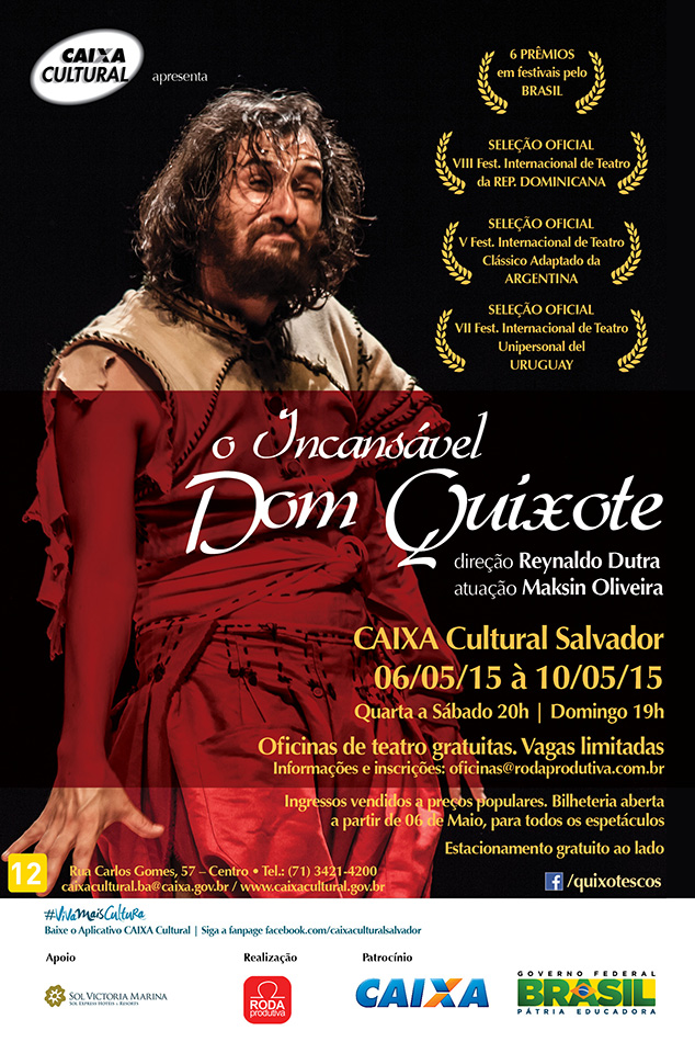 SERVIÇO: O Incansável Dom Quixote Quando: De 6 a 10 de maio Horário: Quarta a sexta-feira, às 20h, sábado e domingo, às 19h Local: Caixa Cultural Salvador – Rua Carlos Gomes 57 Centro Salvador / BA; Informações: 71 3421-4200 Ingressos: R$ 8 e R$ 4 Classificação: 12 anos Duração: 70 minutos Inscrição para oficina A(u)toroficinas@rodaprodutiva.com.br