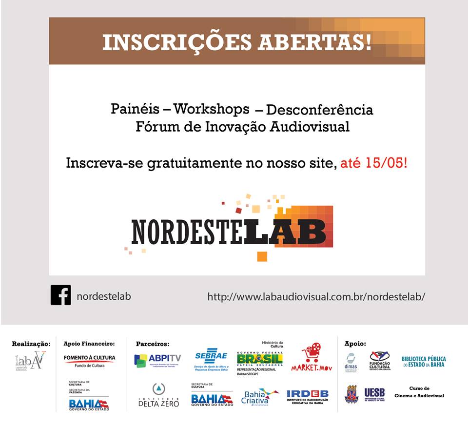 Estão abertas, até o dia 15 de maio, as inscrições para participantes no Nordeste.LAB, projeto que tem como objetivo fomentar o mercado audiovisual baiano/nordestino. Inicialmente realizadas apenas para as rodadas de negócios, agora elas seguem abertas para os demais espaços do evento que acontecerá entre 20 e 23 de maio, no Complexo Cultural dos Barris – Salvador-BA. É esperada participação de produtores, realizadores, estudantes e interessados no universo do mercado audiovisual.