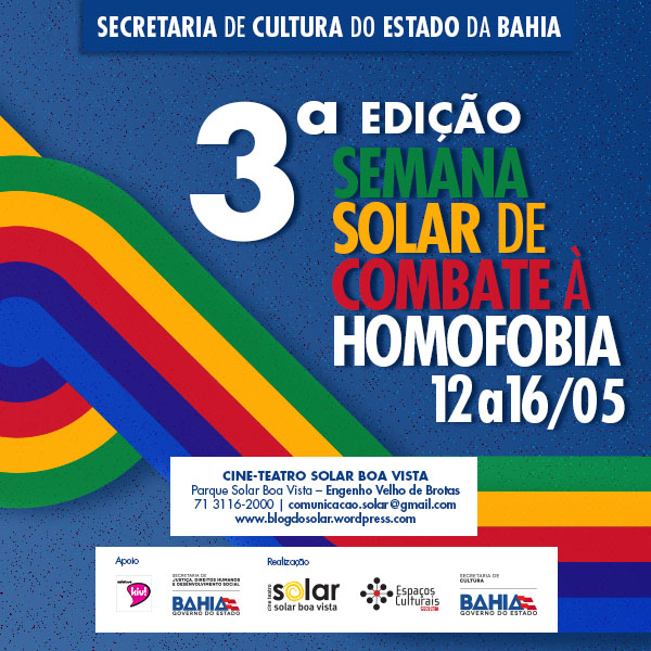 Como parte da programação do Mês da Diversidade #OcupeSeuEspaço - ação da Secretaria de Cultura do Estado da Bahia (SecultBA) através da Diretoria de Espaços Culturais (DEC) -, o Cine Teatro Solar Boa Vista realiza a 3ª edição da  Semana Solar de Combate à Homofobia, entre os dias 12 e 16 de maio, no Parque Solar Boa Vista, Engenho Velho de Brotas. O projeto é uma iniciativa do Solar Boa Vista -  um dos 17 espaços culturais da SecultBA - e conta com a parceria da Secretaria de Justiça, Direitos Humanos e Desenvolvimento Social do Estado (SJDHDS) e do Coletivo Kiu!. A Semana SOLAR de Combate à Homofobia tem como mote o 17 de maio, dia Internacional de Combate à Homofobia. Assim, programação realizada será composta por atividades que provoquem a reflexão e discussão sobre homofobia, lesbofobia, transfobia, além da diversidade sexual. Para a coordenadora do Cine Teatro Solar Boa Vista, Simone Braz, o evento reforça e legitima espaços de discussão e reflexão acerca dos diversos tipos de preconceito. "O evento visa discutir e construir políticas públicas em prol dos direitos humanos, se considerarmos os inúmeros casos de violência contra as pessoas LGBTT''s - Lésbicas, Gays, Bissexuais, Travestis e Transexuais", explica. Iniciando a programação, o Circuito Popular de Cinema e Vídeo (CPCV), através do projeto CPCV Especial, exibe no dia 12, a partir das 19h30, o documentário "Atrás dos Olhos", dirigido por Fábio Fernandes e André Araújo, que participam de um bate-papo após a sessão. A entrada é gratuita e o filme tem classificação de 12 anos. Já no dia 14 de maio, o Solar realiza uma roda de conversa com a temática “Lesbianidades e Negritudes”, trazendo vivências de mulheres lésbicas e negras e as implicações na produção de discursos e lugares sociais, ao mesmo tempo em que estes podem resultar em tensões e preconceitos. No último dia da programação especial, 16, acontece o Minicircuito dos Direitos Humanos pela Diversidade, das 13h às 23h. O evento é uma parceria do Núcleo de Políticas para LGBTT''s (SJDHDS) com o Solar Boa Vista. “Essa parceria tem sido muito importante para nós, pois pensamos o evento como uma tentativa de voltar o olhar do público para a arte, dialogando com as demandas LGBTT para, depois desse momento, buscar construir políticas públicas cada vez mais sólidas junto com o Estado”, conta o coordenador do Núcleo, Vinicius Alves. O Minicircuito contará ainda com rodas de diálogos temáticos, que discutirão questões de gênero, sexualidade, políticas públicas LGBTT; workshops de maquiagem Drag Queen e King; intervenção visual com o Grafitti pela Diversidade, apresentado pelo Ateliê Aberto, com Luiz Pablo e Chermie Ferreira; e a performance “Bicha também Pixa”, com Misael Franco; além de uma Feira dos Direitos Humanos, com stands de serviços voltados para o público LGBTT, exposição de artesanato, moda, artes visuais, gastronomia, com a equipe da Cafofeira. Na área externa do Solar acontece o Baba no Brejo, partida de futebol entre times femininos, e o Isoporzão da Sapatão, ação de socialização de mulheres lésbicas, bissexuais e trans, realizado pelo Coletivo Kiu!. Fechando a programação, será realizada a abertura oficial do Maio da Diversidade, projeto da Secretaria de Justiça e Direitos Humanos e Desenvolvimento Social, que acontece no mesmo dia 16, a partir das 18h30, com entrada gratuita e conta também com a apresentação do Cabaret Lacração. Confira a programação completa no blog do SOLAR. Espaços Culturais da SecultBA - A Secretaria de Cultura do Estado da Bahia (SecultBA) mantém 17 espaços culturais geridos pela Diretoria deEspaços Culturais (DEC), e localizados em diversos Territórios de Identidade. Destes, cinco encontram-se em Salvador -  Cine Teatro Solar Boa Vista, Espaço Xisto Bahia, Casa da Música de Itapuã, Centro de Cultura de Plataforma e Espaço Cultural Alagados - e 12 nos municípios de Alagoinhas, Feira de Santana, Guanambi, Itabuna, Jequié, Juazeiro, Lauro de Freitas, Mutuípe, Porto Seguro, Santo Amaro, Valença e Vitória da Conquista. Para mais informações sobre os espaços, acesse o site dos Espaços e o site da SecultBA. Mês da Diversidade #OcupeSeuEspaço - No mês em que se comemora o Dia de Combate à Homofobia - 17 de maio - a Secretaria de Cultura do Estado da Bahia, através da Diretoria de Espaços Culturais, lança a campanha Mês da Diversidade #OcupeSeuEspaço, que  tem como objetivo divulgar todas as ações de seus Espaços Culturais que trabalhem com a temática da diversidade. Serviço O quê: Semana do Solar de Combate à Homofobia + Minicircuito dos Direitos Humanos pela Diversidade Local: Cine Teatro Solar Boa Vista, localizado no Parque Solar Boa Vista, Engenho Velho de Brotas Quando: 12 a 16 de Maio Quanto: Gratuito Realização: Cine Teatro Solar Boa Vista; Diretoria de Espaços Culturais; Secretaria de Cultura do Estado da Bahia; Núcleo de Políticas para Lésbicas, Gays, Bissexuais, Travestis e Transexuais (LGBTT); Secretaria de Justiça, Direitos Humanos e Desenvolvimento Social da Bahia. Contatos: 71 3116 2000 | E-mail: comunicacao.solar@gmail.com Saiba mais!