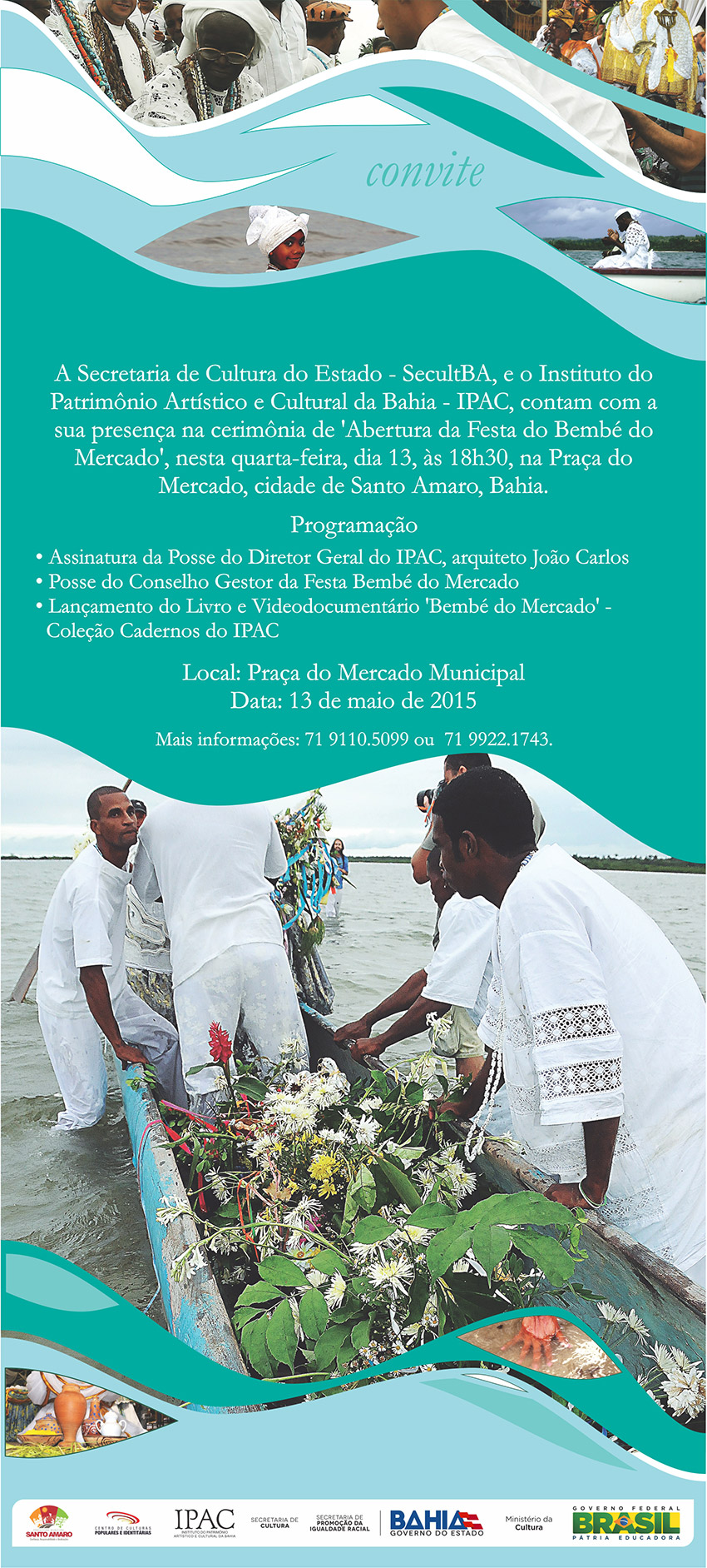 CONSELHO GESTOR – Para o diretor do IPAC, João Carlos de Oliveira, além das comemorações é importante promover ações de proteção à festa. “Trata-se de uma manifestação popular, um bem cultural intangível que depende das comunidades para existir, por ser um fenômeno espontâneo, social e religioso. Por isso, na abertura de amanhã (13) anunciaremos um Conselho Gestor da Festa do Bembé”, afirma João Carlos. O conselho será composto por representantes de órgãos e secretarias municipais e estaduais, além de integrantes da sociedade civil e dos terreiros de candomblé.