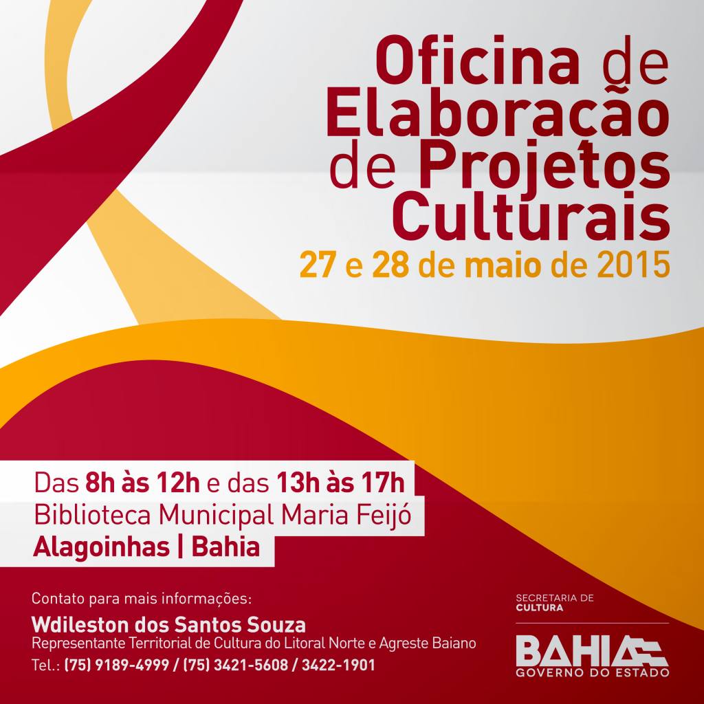 Visando qualificar artistas e produtores culturais, a Secretaria de Cultura do Estado da Bahia (SecultBA) em parceria com a Secretaria de Cultura, Esporte e Lazer  de Alagoinhas (SECTEL) promove a Oficina de Elaboração de Projetos Culturais nos dias 27 e 28 de maio, às 8h, na Biblioteca Municipal Maria Feijó. Ministradas pelo Representante Territorial da Cultura Wdileston Souza, as oficinas têm por intuito fornecer à comunidade cultural uma abordagem teórica e prática sobre projetos, perpassando sua estrutura de elaboração, apresentação e avaliação das atividades desenvolvidas em classe. Os interessados em participar não precisam preencher nenhum formulário ou ficha de inscrição. As turmas são definidas por ordem de chegada ao local de realização do evento. Territórios Culturais - Com o objetivo de identificar prioridades temáticas definidas a partir da realidade local, possibilitando o desenvolvimento equilibrado e sustentável entre as regiões, o Governo da Bahia, através da SecultBA, passou a reconhecer a existência de 27 Territórios de Identidade, constituídos a partir da especificidade de cada região. Sua metodologia foi desenvolvida com base no sentimento de pertencimento, onde as comunidades, através de suas representações, foram convidadas a opinar. Serviço Oficina de Elaboração de Projetos Culturais Onde: Biblioteca Municipal Maria Feijó - Alagoinhas/BA Quando: 27 e 28 de maio de 2015 Horário: das 8h às 12h e das 13h às 17h