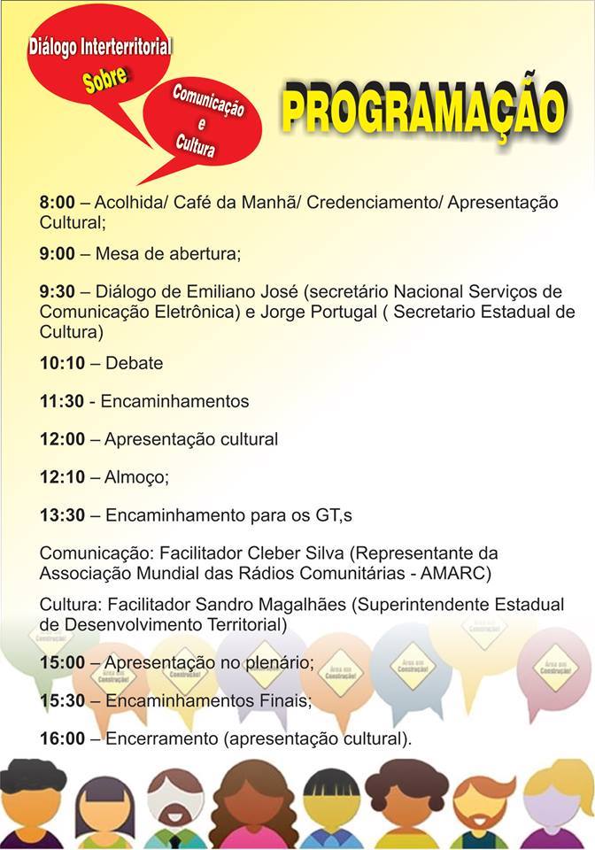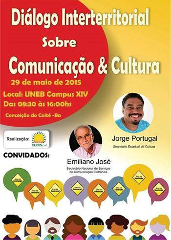 O evento será realizado no dia 29 de maio de 2015, das 09h às 17h, na Universidade estadual da Bahia (UNEB)/ Campus XIV, na cidade de Conceição do Coité e contará com a presença do Secretário Nacional de Serviços de Comunicação Eletrônica, Emiliano José, do secretario de Cultura, Jorge Portugal e do superintendente estadual de Desenvolvimento Territorial, Sandro Magalhães.