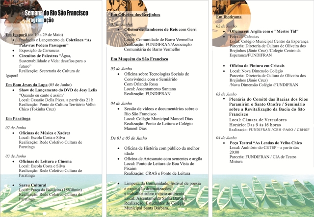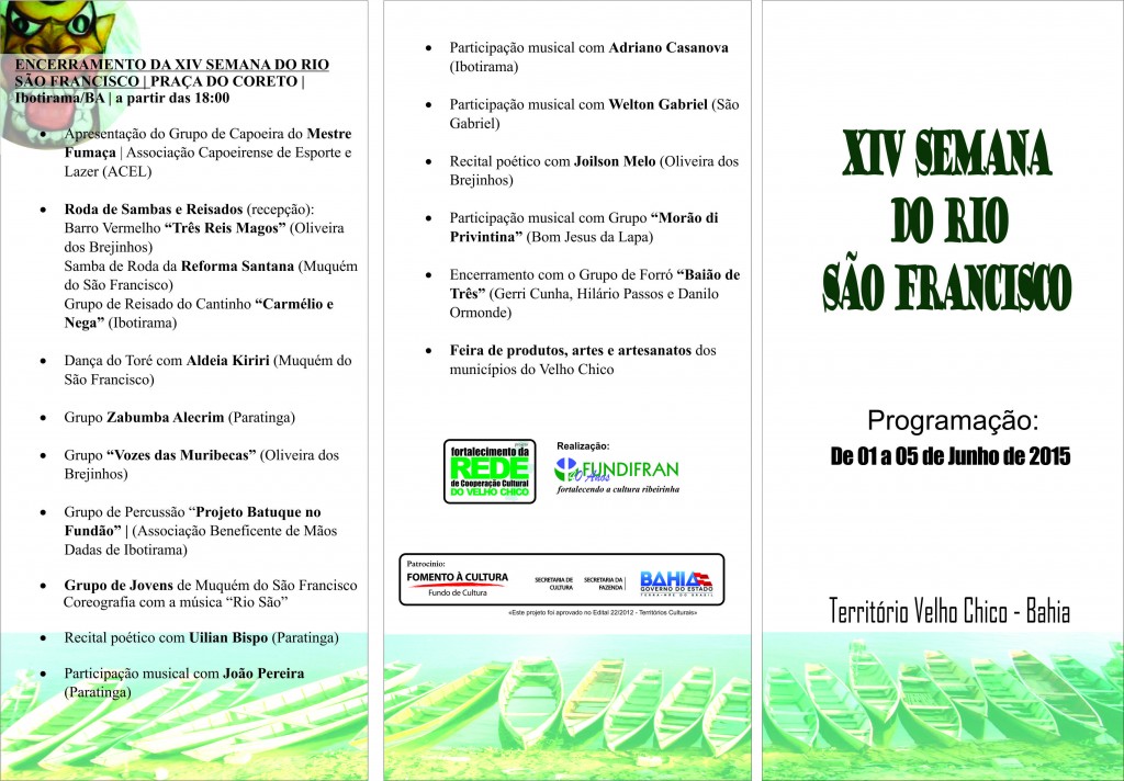Entre os dias 01 e 05 de junho, os municípios do Território Velho Chico serão contemplados com a XIV Semana do Rio São Francisco, ação cultural fruto do projetoFortalecimento da Rede de Cooperação Cultural do Território Velho Chico. O projeto, que foi contemplado por meio do edital Territórios Culturais, vinculado ao Fundo de Cultura da Bahia (FCBA), conta com o apoio da Secretaria de Cultura do Estado da Bahia (SecultBA) e da Secretaria da Fazenda (Sefaz) proposto pela Fundação de Desenvolvimento Integrado do São Francisco (FUNDIFRAN). A semana vai promover oficinas, rodas de leitura, saraus, shows de lançamentos de DVD, exposição de filmes e carrancas, artes visuais, publicação de livros em seis cidades que compreendem o Território Velho Chico (Bom Jesus da Lapa, Ibotirama, Igaporã, Muquém do São Francisco, Oliveira dos Brejinhos, Paratinga). Todas as atividades visam estimular a participação da população em geral conscientizando sobre a importância e cuidados que devem ser tomados com o rio São Francisco, através de inúmeras linguagens artísticas. O encerramento do evento acontecerá na sexta (05), na cidade de Ibotirama, e contará com a presença dos Grupos de Reisados e Pífano, capoeira, samba de roda, grupos de percussão, recital poético, musicais, dança do toré, coreografias, exposições de produtos culturais, artes e artesanato trazidas pelos municípios do Território. Fundo de Cultura do Estado da Bahia (FCBA) – Criado em 2005 para incentivar e estimular as produções artístico-culturais baianas, o Fundo de Cultura é gerido pelas Secretarias da Cultura e da Fazenda. O mecanismo custeia, total ou parcialmente, projetos estritamente culturais de iniciativa de pessoas físicas ou jurídicas de direito publico ou privado. Os projetos financiados pelo Fundo de Cultura são, preferencialmente, aqueles que apesar da importância do seu significado, sejam de baixo apelo mercadológico, o que dificulta a obtenção de patrocínio junto à iniciativa privada. O FCBA está estruturado em 4 (quatro) linhas de apoio, modelo de referência para outros estados da federação: Ações Continuadas de Instituições Culturais sem fins lucrativos; Eventos Culturais Calendarizados; Mobilidade Artística e Cultural e Editais Setoriais. PROGRAMAÇÃO: