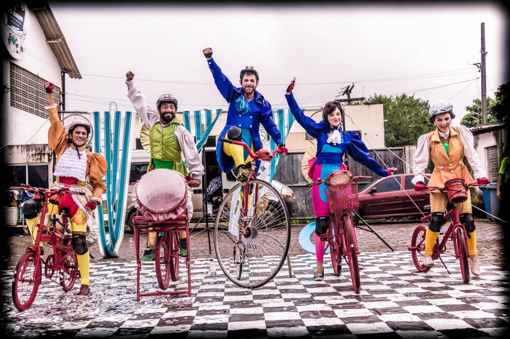 As bicicletas carregam os elementos de cena necessários para a realização do espetáculo. Uma vez chegando no espaço cênico predeterminado, surpreendentemente, elas se transformam no cenário da peça. Assim, tubos retráteis, devidamente acoplados em todas as bicicletas e levantados com o uso de manivelas ou roldanas, levam no seu topo, cordas que são içadas a três ou quatro metros de altura, decorado com fitas, bandeiras e outros elementos, sugerindo uma alegre lona de circo. Toda essa arrumação é executada ao som de uma música, emitida por um sistema de som, também acoplado em um dos veículos.