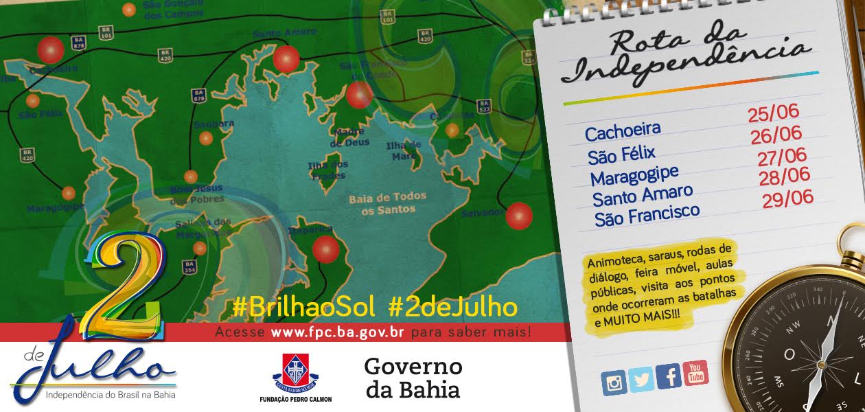 No dia 25 (quinta-feira), em Cachoeira, a Rota da Independência terá início com o ônibus da Feira Móvel, iniciativa da Diretoria do Livro e Leitura (DLL) da Fundação Pedro Calmon, que distribuirá kit-livros e comercializará obras de autores baianos com preços a partir de R$5, além de apresentações poéticas das crianças do Grupo Rouxinol de Poesia (Cachoeira). O público terá ainda a Biblioteca Móvel, com atividades de leitura, sorteio de kits livro, contação de histórias temática e o Tabuleiro Virtual 2 de Julho, jogo lúdico educativo que testa o conhecimento do público sobre a data histórica.