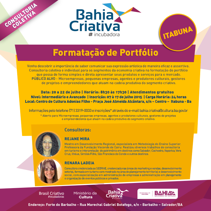 O escritório Bahia Criativa - fruto de um convênio firmado entre o Ministério da Cultura e o Governo da Bahia, gerido pela Secretaria de Cultura do Estado (SecultBA), através da Superintendência de Promoção Cultural – promove entre os dias 20 e 22 de julho de 2015, de 8h30 às 17h30, a consultoria coletiva Formação de Portfólio. A ação será realizada pelas consultoras Rejane Mira e Renara Telma Ladeia no Centro de Cultura Adonias Filho, espaço cultural administrado pela SecultBA em Itabuna (BA). A consultoria é gratuita e as inscrições estão abertas até o dia 17/07 através do e-mail bahia.criativa@cultura.ba.gov.br.