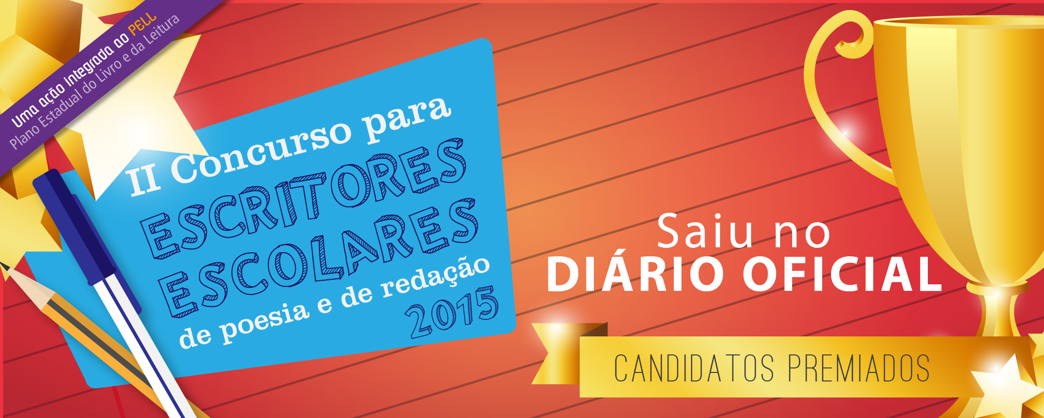 Saiu no Diário Oficial do Estado da Bahia da última quarta (22/07) a lista de premiados do II Concurso para Escritores Escolares de Poesia e de Redação 2015. O Concurso foi direcionado para estudantes do Ensino Fundamental I, II e Médio e promovido pela diretoria do Livro e da Leitura (DLL), unidade da Fundação Pedro Calmon/Secretaria de Cultura do Estado da Bahia,