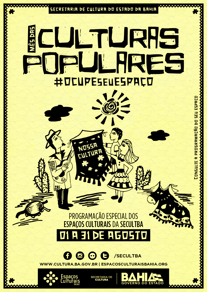 Em agosto, mês em que são celebradas as culturas populares, através do Dia Nacional do Folclore (22), os espaços culturais da Secretaria de Cultura do Estado da Bahia (SecultBA) oferecem opções para todos os gostos e idades. São festivais, oficinas, espetáculos de teatro e dança em diferentes modalidades que contemplam expressões culturais diversas dos 11 territórios de identidade da Bahia em que estão localizados 15 centros de cultura administrados pela SecultBA. O Cine Teatro Solar Boa Vista, localizado no bairro do Engenho Velho de Brotas, em Salvador, exibe de 07 a 09, às 20h, o espetáculo Rebento. A obra da Cia de Teatro Metamorfose traz a ancestralidade africana dos mitos e das lendas através da oralidade das personagens que instauram diálogos e ações entre si. A entrada é gratuita. O espaço também apresenta nos dias 14 e 21, a comédia Dona Bucéfala, um espetáculo cômico e interativo onde uma senhora de 50 anos usa a sua experiência de vida para aconselhar e resolver os problemas de pessoas que a procura. As entradas custam R$ 10 (inteira) e R$ 5 (meia). No Centro de Cultura de Alagoinhas, no dia 07, às 19h, acontece a abertura da exposição Minérios do fotógrafo Jovam Matos. A exposição itinerante é composta pelo diálogo entre as esculturas de pedras portuguesas com objetos que compõem o cotidiano do Velho Centro de Salvador.  A entrada é gratuita. O Centro Cultural Plataforma, no subúrbio ferroviário de Salvador traz no dia 01, às 19h, o Sarau dos Herdeiros. O evento de música de poesia traz o grupo residente do espaço, o Herdeiros de Angola, que juntamente com Igor Reis e sua banda apresentam um show híbrido com canções autorais e releituras, mesclando rock, cantoria e ritmos da cultura popular brasileira. No dia 02, às 17h, o espaço recebe o concurso Miss Salvador 2015. A classificação é livre e as entradas custam R$ 20 (inteira) e R$10 (meia). Também no subúrbio ferroviário de Salvador, o Espaço Cultural de Alagados recebe no dia 07, às 15h, a Camerata Quadro Solar, do projeto Sextas Instrumentais, uma parceria entre a SecultBA e a Orquestra Sinfônica da Bahia (OSBA) que circula de maneira itinerantes pelos espaços culturais da região metropolitana de Salvador até dezembro. A camerata irá tocar os quartetos para flauta e cordas de A .W. Mozart e explorar o repertório lírico no espaço. A entrada é gratuita. No dia 20 a literatura toma conta do espaço na sessão de contação de histórias africanas. A iniciativa é da Biblioteca Clementina de Jesus e tem como objetivo resgatar a valorização da cultura afro-brasileira com crianças e adolescentes. Os ingressos custam R$ 5 (inteira) e R$ 2,50 (meia). No Espaço Xisto Bahia, localizado no bairro dos Barris, em Salvador, o mês é dedicado a arte milenar da palhaçaria. De 03 a 30 de agosto, o espaço realiza o festival Nossa, que Palhaçada, que conta com ações na rua, exposições e espetáculos consagrados como o Cabaré do Riso, de Demian Reis. Para conferir a programação completa acesse o blog do Espaço Xisto. Em Feira de Santana, o Centro de Cultura Amélio Amorim recebe no dia 06 a turnê Troco Likes, do cantor brasiliense Tiago Iorc. Troco Likes, disco autoral do cantor, é seu primeiro trabalho em português e reflete um processo de Iorc se entender cada vez mais como brasileiro, visto que foi criado no exterior. As entradas custam R$ 100 (inteira) e R$ 50 (meia). O centro também recebe nos dias 07, 08 e 09, a 28ª edição do Projeto Dança São Paulo nível Brasil (PRODANSP). O encontro é uma oportunidade para que os bailarinos amadores aprimorem seus movimentos, propostas coreográficas e troquem experiências com os demais participantes. As entradas custam R$40 (inteira) e R$20 (meia). Também no Amélio Amorim, acontece nos dias 29 e 30, das 13h às 22h a feira de cultura nerd Batubil. O evento ocupará todos os espaços do Centro de Cultura e contará com personalidades da internet, como a equipe dos canais do YouTube Mundo Canibal Jovem Nerd. A ação também contempla um campeonato de games, concurso de cosplay, kung fu e um espaço para batalha campal, categoria que reproduz antigas batalhas medievais. No Centro Cultural de Guanambi, nos dias 22 e 23, às 20h, a Cia de Teatro D4 traz o espetáculo Sorte no Amor Azar na Sorte. A trama conta a história de cinco jovens que por não serem bem sucedidos com o namoro real partem para o virtual, ambos se apaixonam por uma jovem que conheceram pela internet e marcam um encontro com a mesma. É aí que começa a confusão. As entradas custam R$ 20 (inteira) e R$ 10 (meia). O Centro de Cultura Olívia Barradas oferece durante todo o mês oficinas de dança afro, bboy, hip hop, capoeira, balé clássico, dança de salão, dança contemporânea, teatro, circo, artes visuais, pintura, grafite, maquiagem artística e escultura. As atividades têm preços variados e a inscrição é realizada no local. O Cine Teatro Lauro de Freitas recebe a Camarata Quarteto Novo, no dia 21, às 15 horas.  A apresentação também faz parte do projeto Sextas Instrumentais. A Quarteto Novo tem uma formação bastante diferente das cameratas ou grupos de câmara, pois possui dois instrumentos da família das madeiras e dois instrumentos da família das cordas. A flauta transversal tocada por André Becker e o fagote por Ilza Cruz representam as vozes aguda e grave, respectivamente. Quem também recebe o projeto Sextas Instrumentais é a Casa da Música, em Itapuã. O espaço recebe a camerata da OSBA, no dia 14, às 15h. A entrada é franca. O Centro de Cultura João Gilberto, em Juazeiro, recebe no dia 14, às 22h, o show Para Gil e Caetano, da cantora Margareth Menezes. No show, a intérprete presta sua homenagem aos ícones da música. Os ingressos custam R$ 50 (inteira) e R$ 25 (meia). Também tem diversão para a garotada: entre os dias 11 a 14, 18 a 21 e 25 a 28, ás 8h e 16h, o espaço