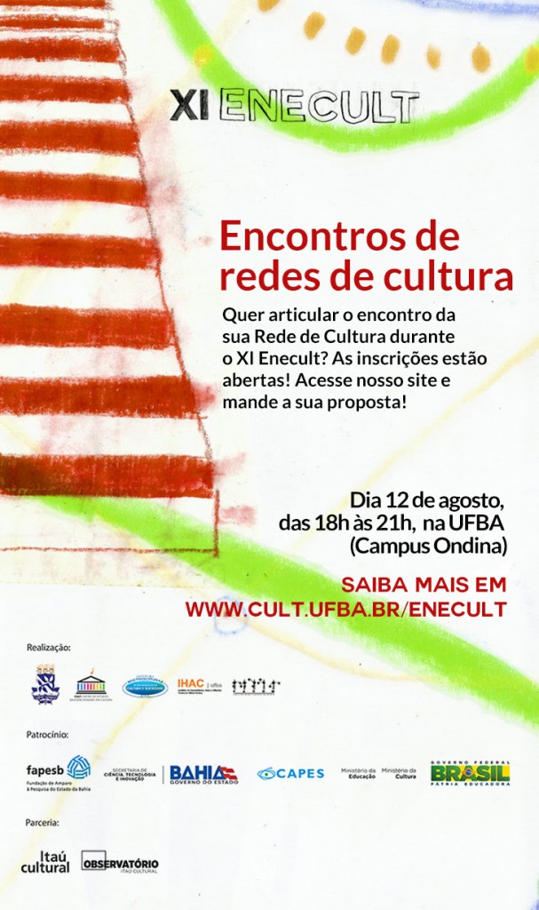 O XI Enecult vai disponibilizar nesta edição um espaço para acolher encontros de redes de cultura. Além de estimular discussões e contatos, a ideia é fomentar o surgimento de novas redes. Já estão confirmados os encontros da Rede de Estudos em Políticas Culturais (Redepcult) e dos Observatórios Estaduais da Economia Criativa (Obecs). As atividades acontecem no dia 12 de agosto, das 18h às 21h, na UFBA (Campus Ondina). Mais detalhes sobre os encontros AQUI. Clique aqui e mande sua proposta. >> Confira a programação completa das sessões de trabalho