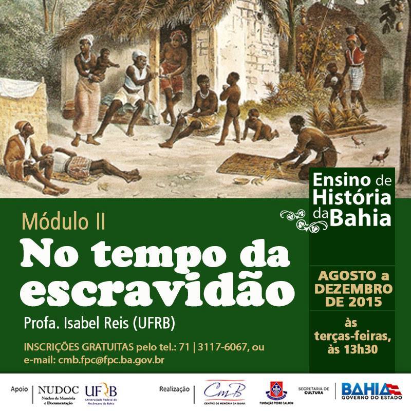 Nas terças-feiras do mês de agosto (04, 11, 18 e 25) das 13h30 às 17h, a professora da Universidade Federal do Recôncavo da Bahia (UFRB), Isabel Cristina Reis ministrará aulas do II módulo de Ensino de História da Bahia, curso promovido pelo Centro de Memória da Bahia (CMB), unidade vinculada à Fundação Pedro Calmon / Secretaria de Cultura do Estado da Bahia. As palestras gratuitas acontecerão na sala Katia Mattoso, Biblioteca Pública do Estado da Bahia (Barris).