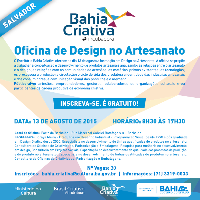 Artesãos, empreendedores, gestores, colaboradores de organizações culturais e/ou participantes da cadeia produtiva da economia criativa podem participar da oficina de formação em Design no Artesanato com a facilitadora Soraya Meira, atividade realizada pelo o escritório Bahia Criativa, fruto de um convênio firmado entre o Ministério da Cultura e o Governo da Bahia, gerido pela Secretaria de Cultura do Estado (SecultBA), no dia 13 de agosto, de 8h30 às 17h30 no Forte do Barbalho. Serão distribuídas 30 vagas com inscrições gratuitas através do e-mail bahia.criativa@cultura.ba.gov.br.