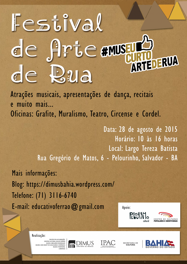 Os museus da Diretoria de Museus do Instituto do Patrimônio Artístico e Cultural da Bahia (Dimus/Ipac) localizados no Pelourinho (Centro Cultural Solar Ferrão, Abelardo Rodrigues, Tempostal e Udo Knoff), além do LabDimus (Laboratório de Educação Digital: Museu, Arte e Cultura), promovem em 28 de agosto, das 10 às 16h, o Festival de Arte de Rua (#museucurtoartederua), no Largo Tereza Batista. “O objetivo do festival é valorizar a arte de rua como ferramenta educativa, através das diversas manifestações artísticas urbanas voltadas para temas atuais e de interesse da sociedade. Além disso, pretendemos estreitar ainda mais a relação museu-escola-sociedade a partir de ações socioeducativas ligadas a prática participativa museológica”, explica Ana Liberato, diretora da DIMUS. De acordo com o diretor geral do IPAC, João Carlos de Oliveira, a arte de rua também é patrimônio cultural e, por isso, é fundamental entender a importância intangível das expressões urbanas na contemporaneidade. “Este festival é uma excelente oportunidade para troca de informações e conceitos de arte e bem cultural, para novos experimentos artísticos, mas sempre respeitando o patrimônio que já é nosso e que temos responsabilidade e devemos cuidar. Só protege quem valoriza, e só valoriza quem conhece. Por isso, imprescindível a troca de conhecimentos entre tantos agentes e segmentos", declarou. Durante o festival serão realizadas apresentações culturais como atrações musicais, dança, recitais e stand up comedy, bem como ações socioeducativas em formato de oficinas e workshop de grafite, teatro, cordel, muralismo e circense. Todas essas atividades acontecerão gratuitamente. Para os grupos interessados em participar das oficinas é necessário agendamento prévio 3116-6740/ educativoferrao@gmail.com. O Festival de Arte de Rua conta com a parceria do Centro de Culturas Populares e Identitárias (CCPI) e Fundação Cultural do Estado da Bahia (Funceb).