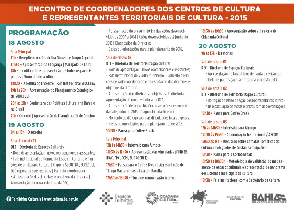 Encontro reunirá representantes territoriais de cultura e os coordenadores de centros de cultura administrados pela Secretaria, entre os dias 18 e 20 de agosto de 2015, no Centro de Cultura Olívia Barradas, em Valença