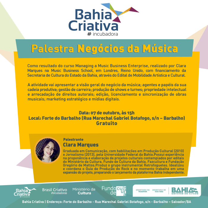 Músicos, produtores e demais profissionais da cadeia produtiva do setor participam da palestra gratuita Negócios da Música, realizada por Clara Marques, no dia 07 de outubro, às 15h, no escritório Bahia Criativa - fruto de um convênio firmado entre o Ministério da Cultura e o Governo da Bahia, gerido pela Secretaria de Cultura do Estado (SecultBA). A palestra é resultado da experiência de Clara na Music Business School, em Londres, onde participou por quatro meses este ano do curso Managing a Music Business Enterprise, resultado da sua aprovação no edital de Mobilidade Artístico Cultural da SecultBA, com recursos do Fundo de Cultura do Estado da Bahia. Não é necessária inscrição prévia para participar da palestra.