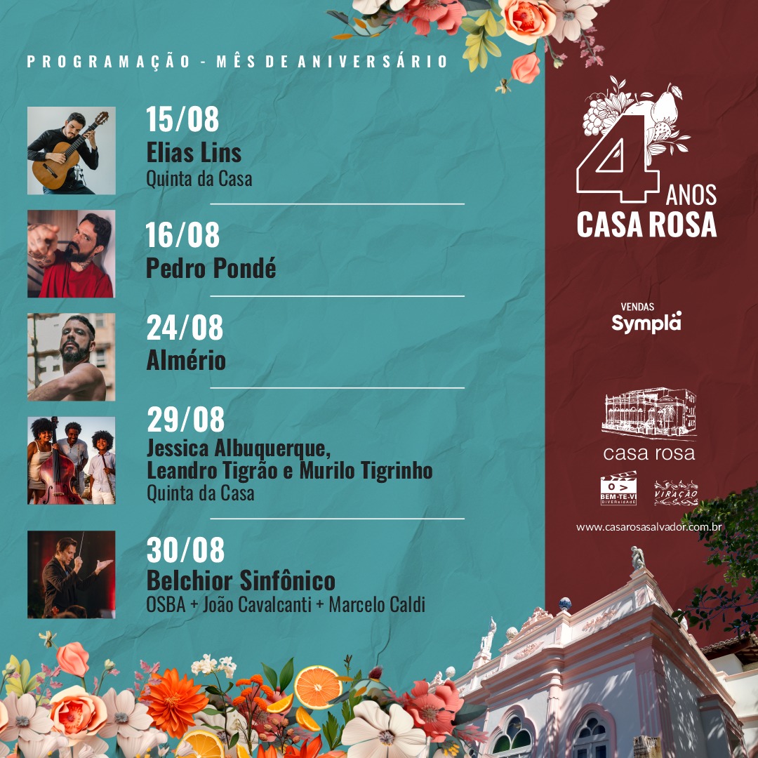 No mês de agosto, também teremos 16 oportunidades para assistir às Cameratas da OSBA. Os quatro grupos de música de câmara da OSBA (Opus Lumen, Bahia Cordas, Quarteto Novo e Quadro Solar) realizarão uma série de oito ensaios abertos na Biblioteca Central do Estado (Barris) e apresentações em outros eventos de Salvador como a Terça Musical do Museu Geológico da Bahia e a Flipelô, na Igreja de São Pedro dos Clérigos (Pelourinho). Confira a programação completa: