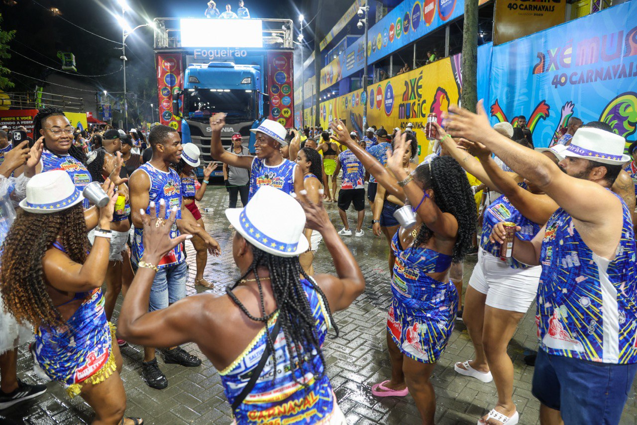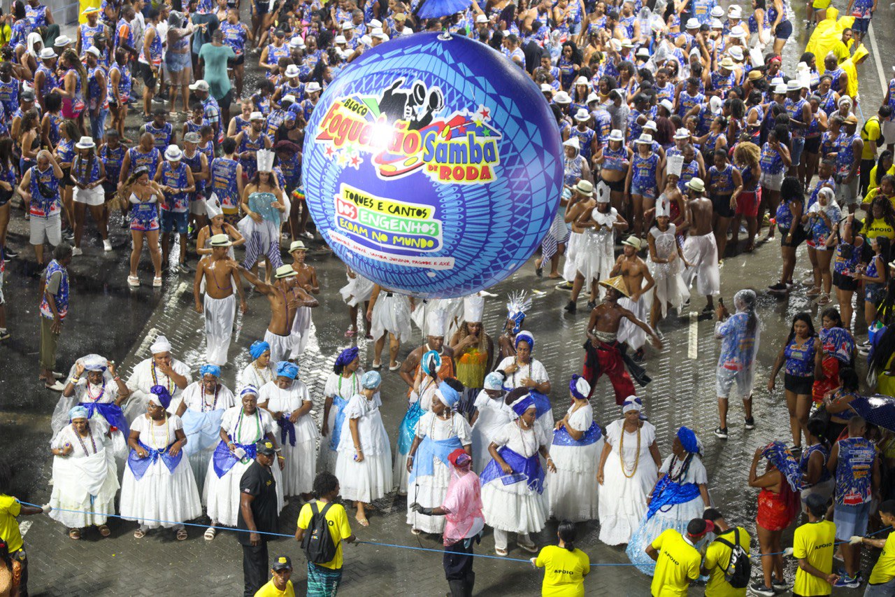 “Falar da nossa musicalidade, dos nossos toques, da nossa percussão, dos atabaques no candomblé, isso ecoou no mundo inteiro", destacou Jorge Fogueirão, presidente da agremiação. O bloco que surgiu na Vasco da Gama, com a tradição do samba junino em 1987, iniciou o primeiro dia de desfile no circuito Osmar lançando música nova: “Sonoridade Ancestral”, composta por Fogueirão e Juca Maneiro. A sede, localizada na rua Onze de Agosto, na Vasco da Gama, fica entre os dois Engenhos. “O samba tem uma contribuição muito forte em todo seguimento musical brasileiro, inclusive para a Axé Music, que completa 40 anos”, destacou Jorge Fogueirão.