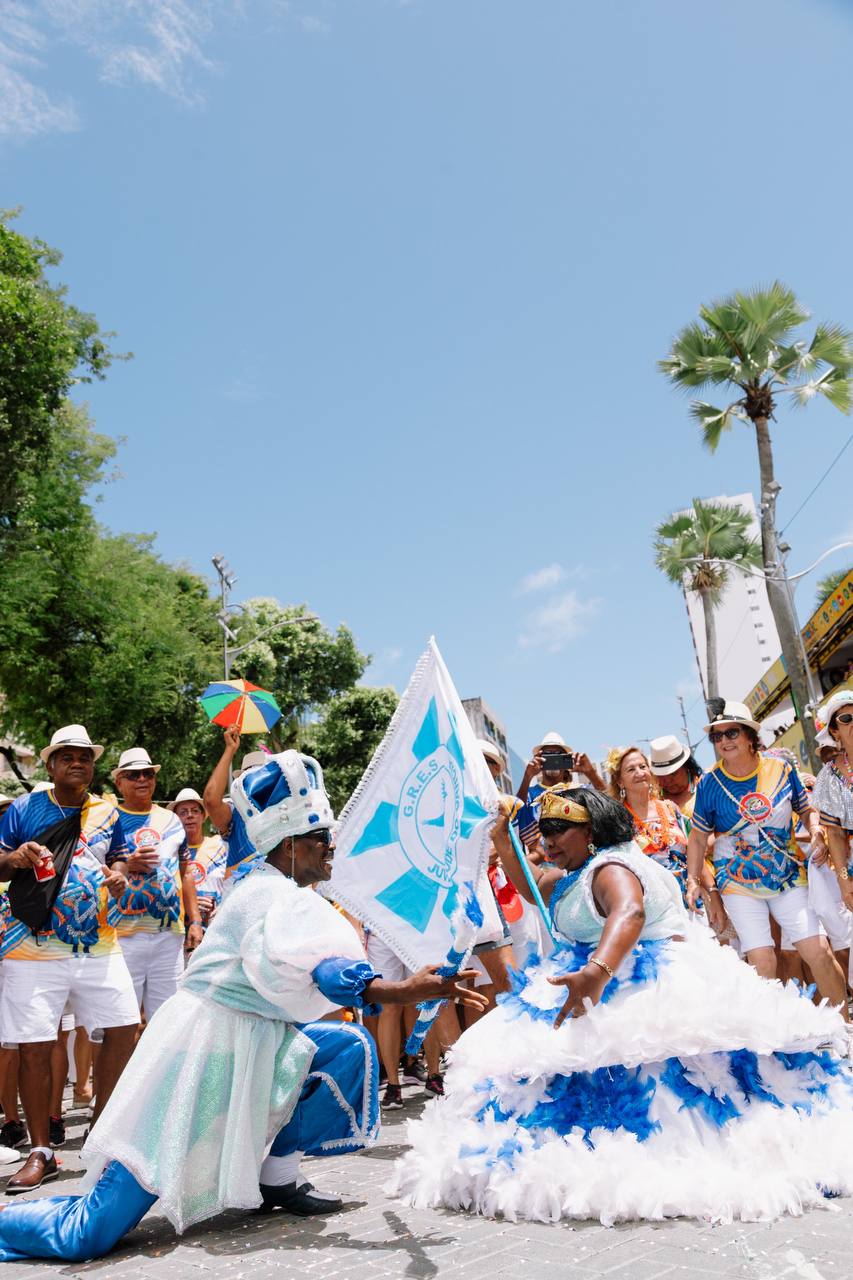 Este ano, o tema ‘O Samba que Ecoa na Bahia - Memórias das Escolas de Samba de Salvador’ homenageou a história do G.R.E.S. Juventude do Garcia e de outras agremiações que marcaram a época, reforçando a importância do samba como parte fundamental da cultura baiana. Durante o desfile, o som dos surdos e tamborins ecoou pelo circuito, embalando os foliões que seguiam animados, vestindo os trajes do bloco em azul e amarelo, com chapéus brancos e lenços brilhantes trançados.