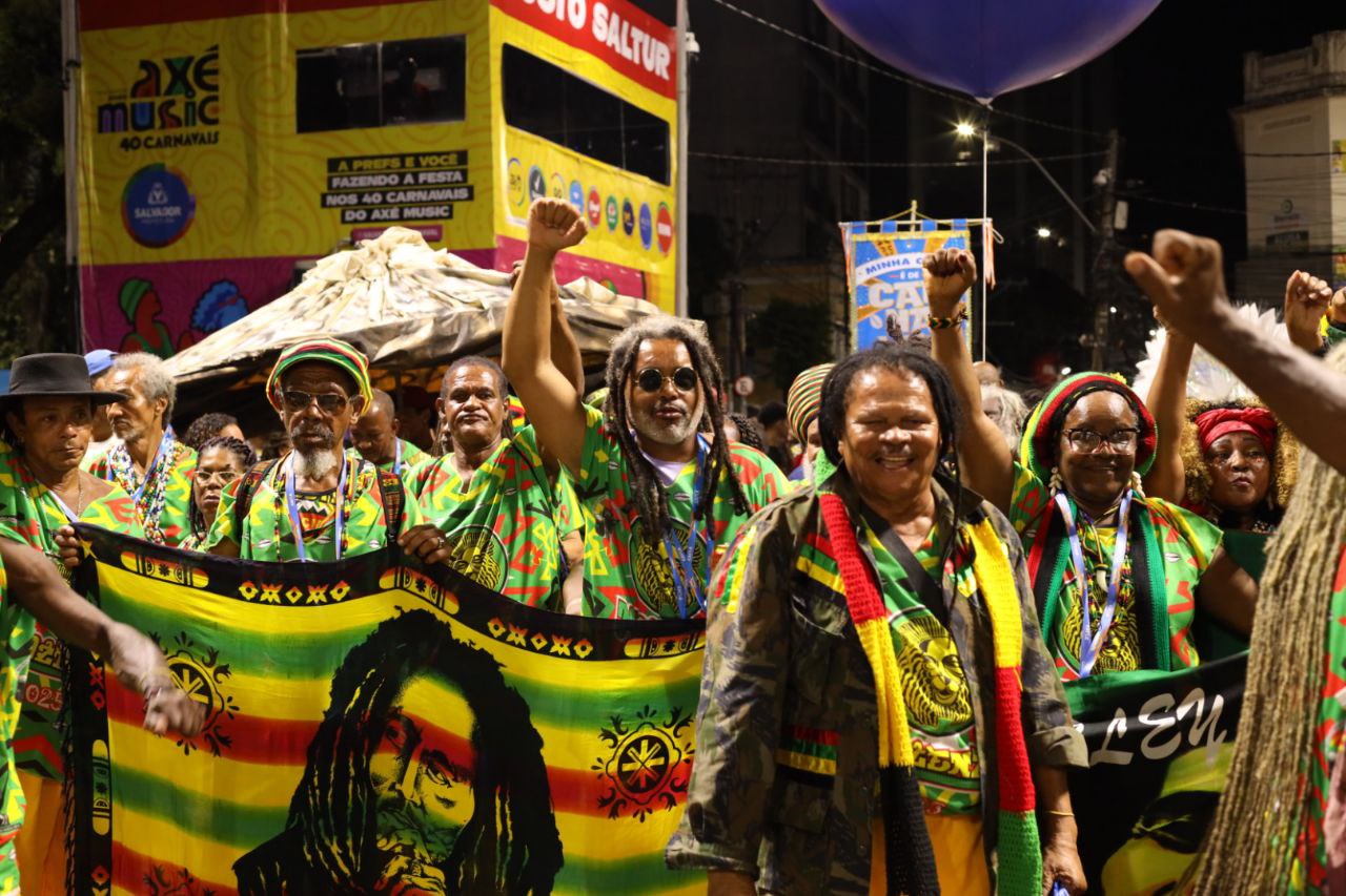 “A inspiração é o grande desfecho da nossa luta”, disse Jorge Santos, presidente do Muzenza. Destacando elementos da cultura jamaicana, o bloco, fundado na Liberdade, em 1981, apresentou ao público presente no Campo Grande os valores da comunidade rastafari, a força do reggae e a devoção ao eterno Bob Marley.