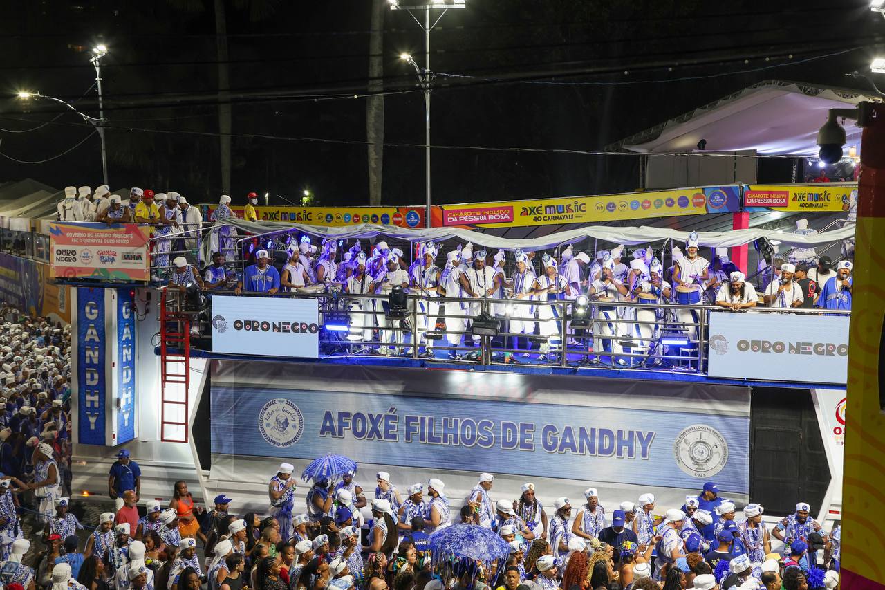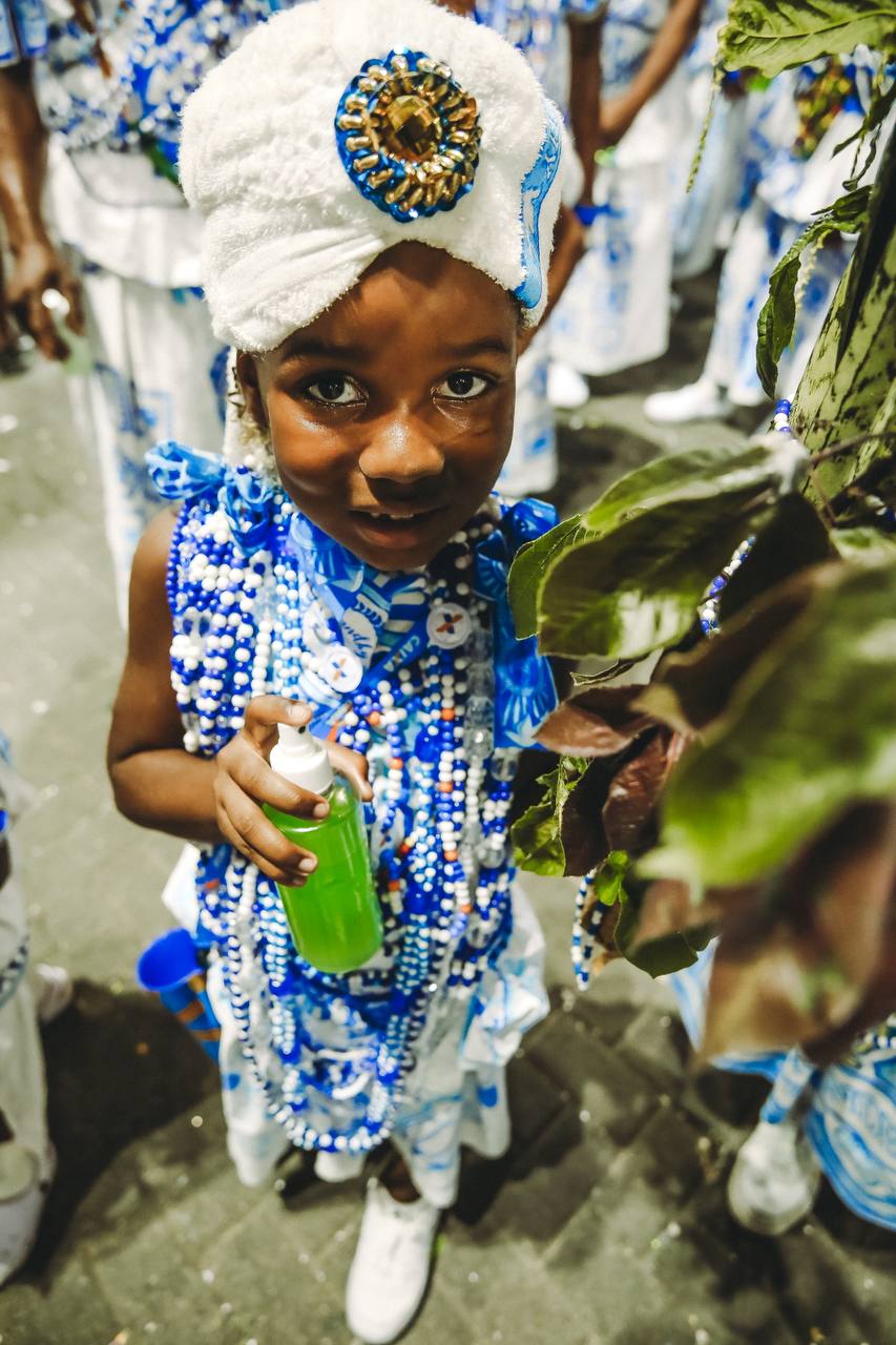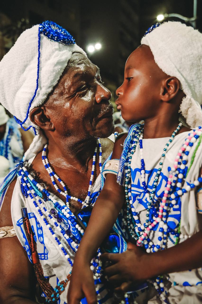 No afoxé Filhos de Gandhy, a tradição é viva e passada de geração para geração. Crianças vestiam o manto branco e azul, acompanhadas de seus pais, dançando Ijexá, em um ambiente de respeito e celebração aos orixás Oxalá e Ogum. O tapete branco da paz levou o aroma da alfazema do Pelourinho — na sede do bloco — até o Campo Grande, ao som do toque do agogô.