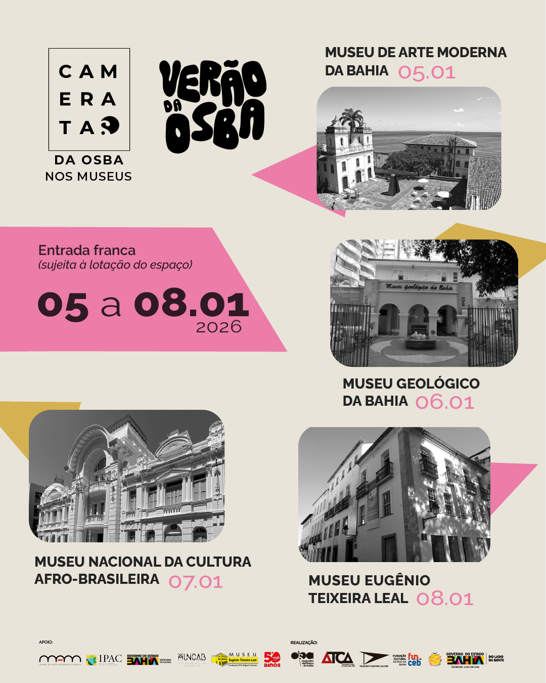 O Verão da OSBA 2026 conta ainda com a realização, entre os dias 05 e 08 de janeiro, da segunda edição do projeto “Cameratas nos Museus”, com apresentações gratuitas em quatro equipamentos culturais de Salvador: Museu de Arte Moderna da Bahia, Museu Geológico da Bahia, Museu Nacional da Cultura Afro-Brasileira (MUNCAB) e Museu Eugênio Teixeira Leal.