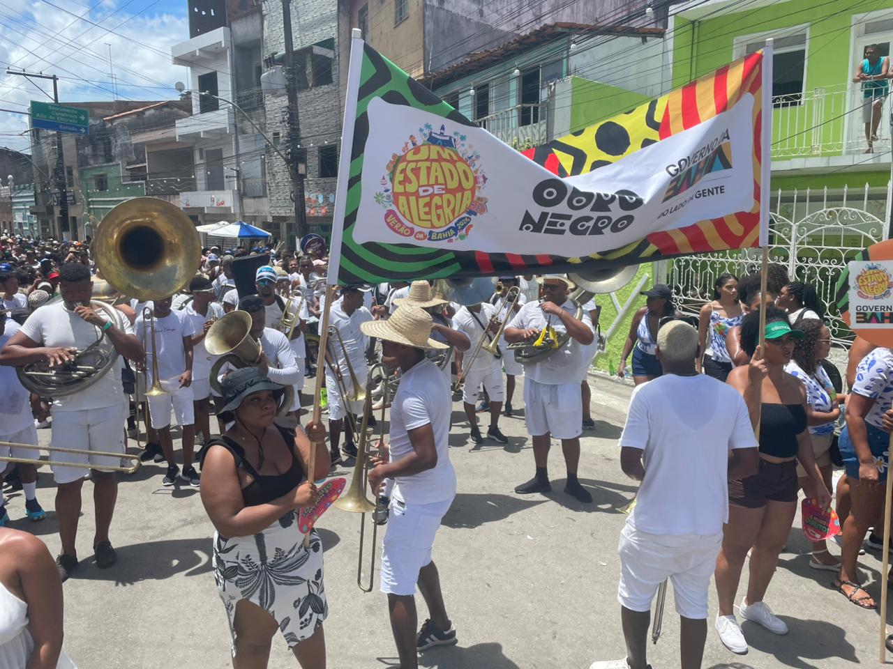 ANCESTRALIDADE - Na sequência do cortejo, em frente à Casa de Dona Canô, a Charanga da Cobrac ocupou o circuito como bloco de chão, com um desfile em homenagem a Dona Nicinha do Samba e Pai Pote, duas referências negras e santo-amarenses. O coordenador geral Leonardo Vinícius lembrou que a presença do grupo na lavagem tem longa trajetória e que o Edital Ouro Negro impacta diretamente a qualidade do trabalho apresentado. “A Charanga da Cobrac participa da lavagem de Santo Amaro desde o início dos anos 90 e o Ouro Negro nos fortalece no sentido de nos dar condição para levar um trabalho melhor, mais organizado, de conseguir colocar na rua um maior número de músicos negros”, comentou.