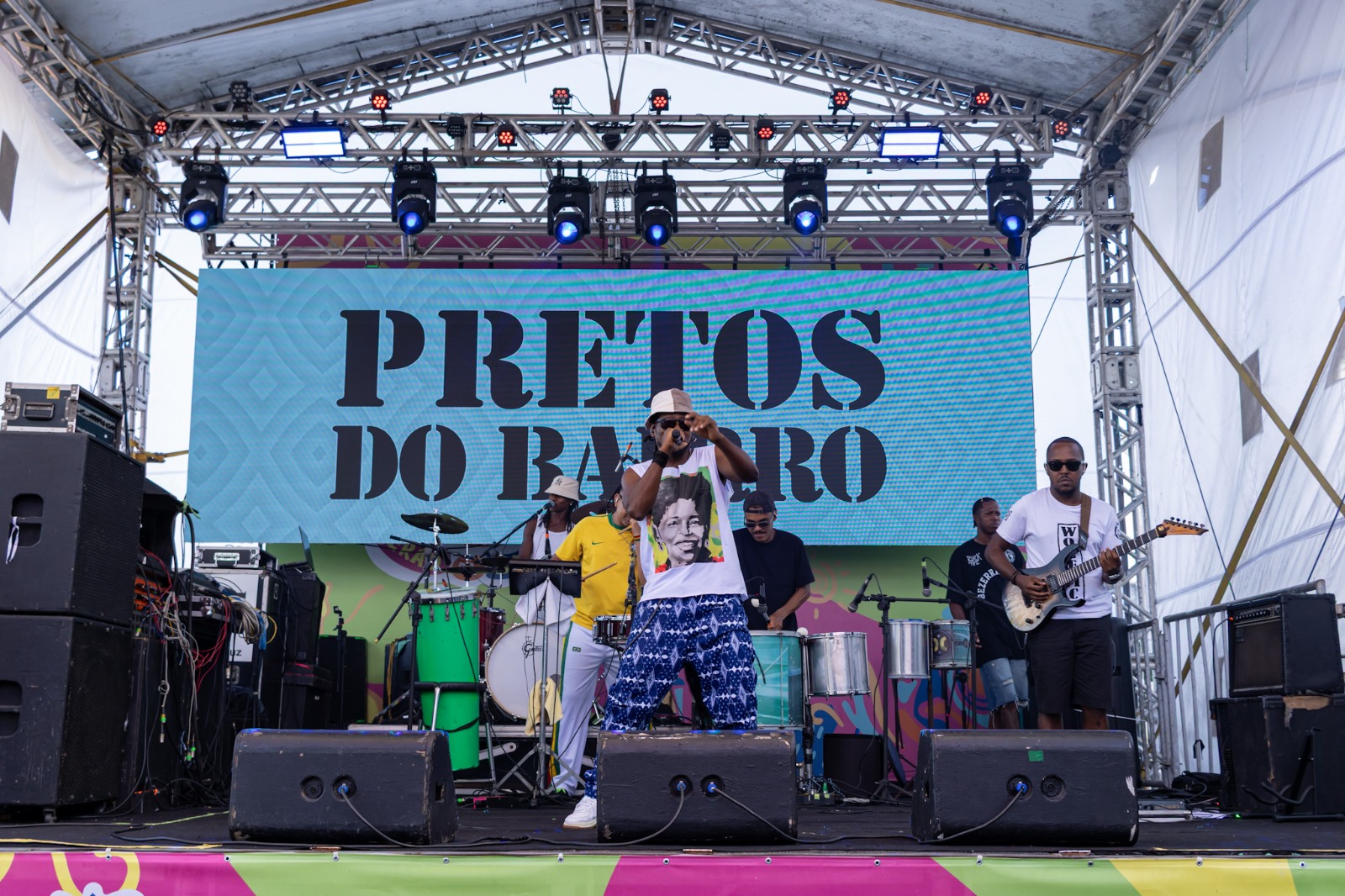 Representando o bairro do Candeal, a banda Pretos do Bairro levou ao palco uma mistura de influências que atravessam territórios musicais e sociais. Para os vocalistas Gato Ferreira e Iran Santos, a apresentação reforça o papel da música como instrumento de expressão e consciência. “É muito importante estar aqui no Pelourinho, nesse espaço maravilhoso, levando nossa música para o mundo e, ainda, informação e conscientização através da arte, reverenciando as musicalidades que vibram nas periferias”, destacaram.