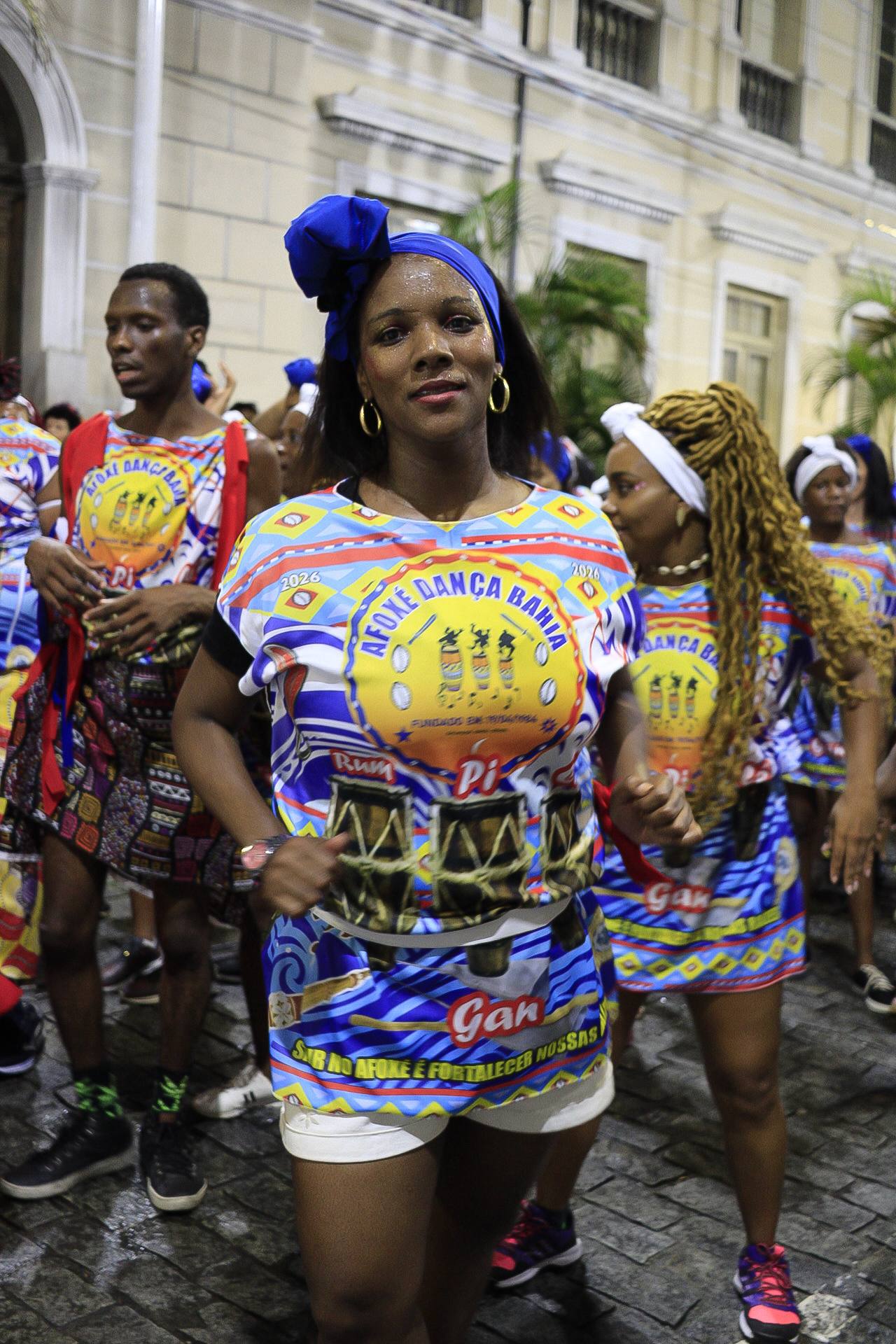 Fundado em 19 de abril de 1984 pelo mestre de capoeira e professor de dança Mestre Macumba, o Afoxé Dança Bahia apresentou neste ano o tema “Rum pi lé Gan”. O lema do Carnaval 2026 do Afoxé reúne os nomes dos três atabaques sagrados (“Rum”, “Rumpi” e “Lé”) utilizados nos rituais de candomblé e umbanda, além do “Gan”, também conhecido como agogô, instrumento fundamental para a condução rítmica e a organização das cerimônias religiosas.