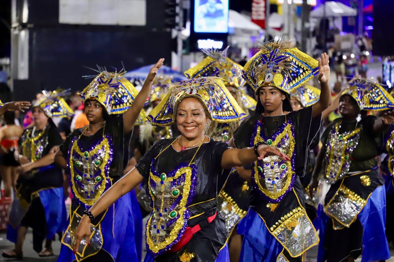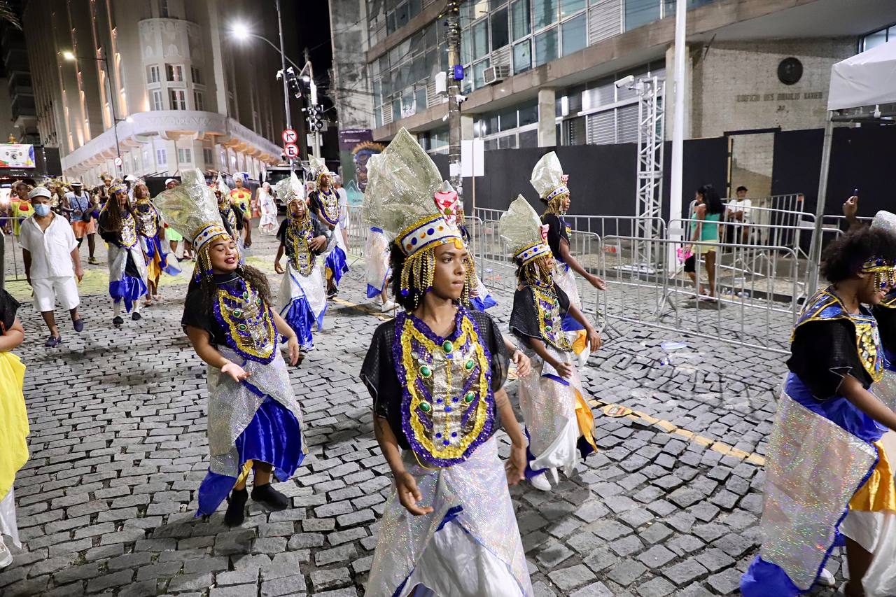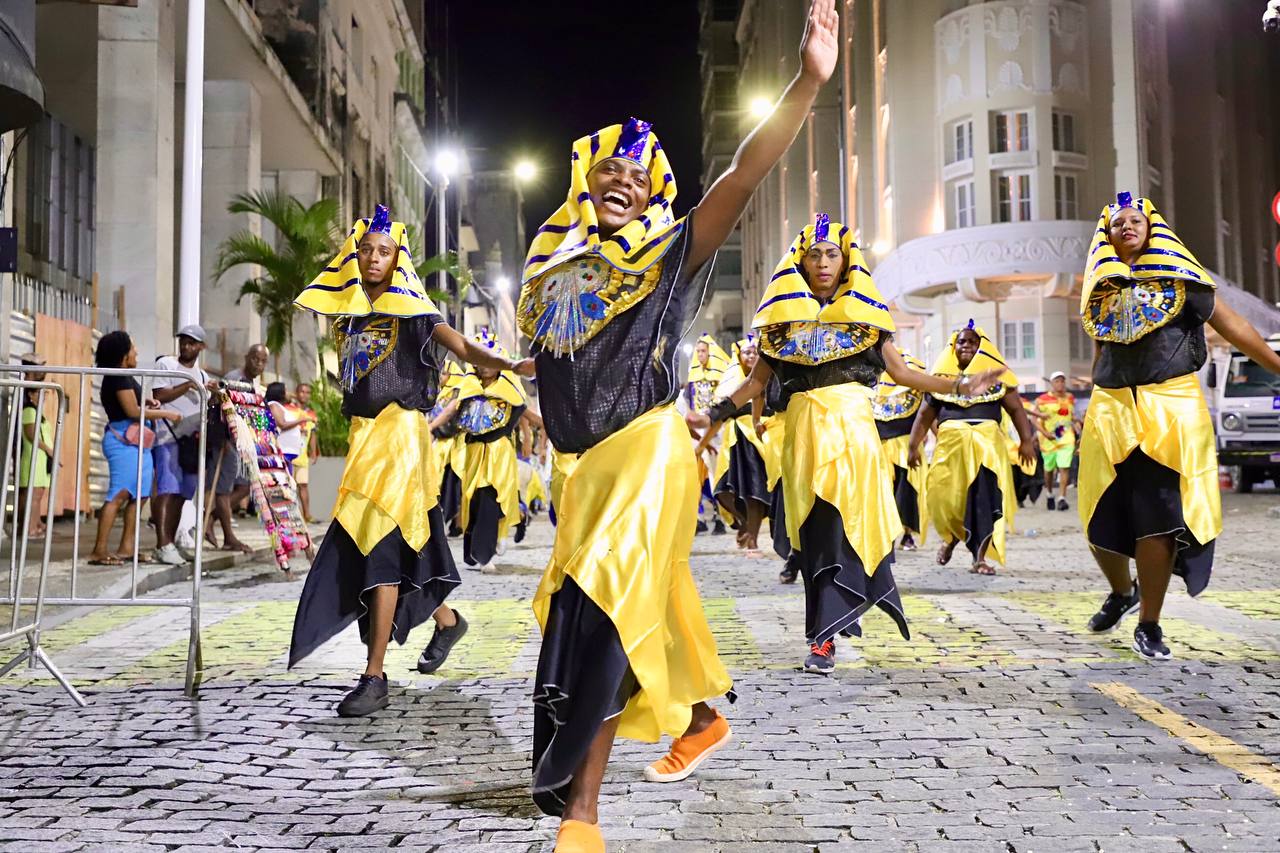 Com alas de dança e de baianas, o bloco apresentou figurinos inspirados na estética do Egito antigo, reinterpretada a partir da cultura afro-brasileira. O dourado intenso, os tecidos luminosos e os adereços que remetiam à nobreza africana transformaram o Centro Histórico em passarela de realeza negra. A ala de dança seguiu o ritmo da percussão e da ala de sopro, conduzindo o cortejo com coreografias sincronizadas que reforçaram o protagonismo do corpo como território de memória e resistência.