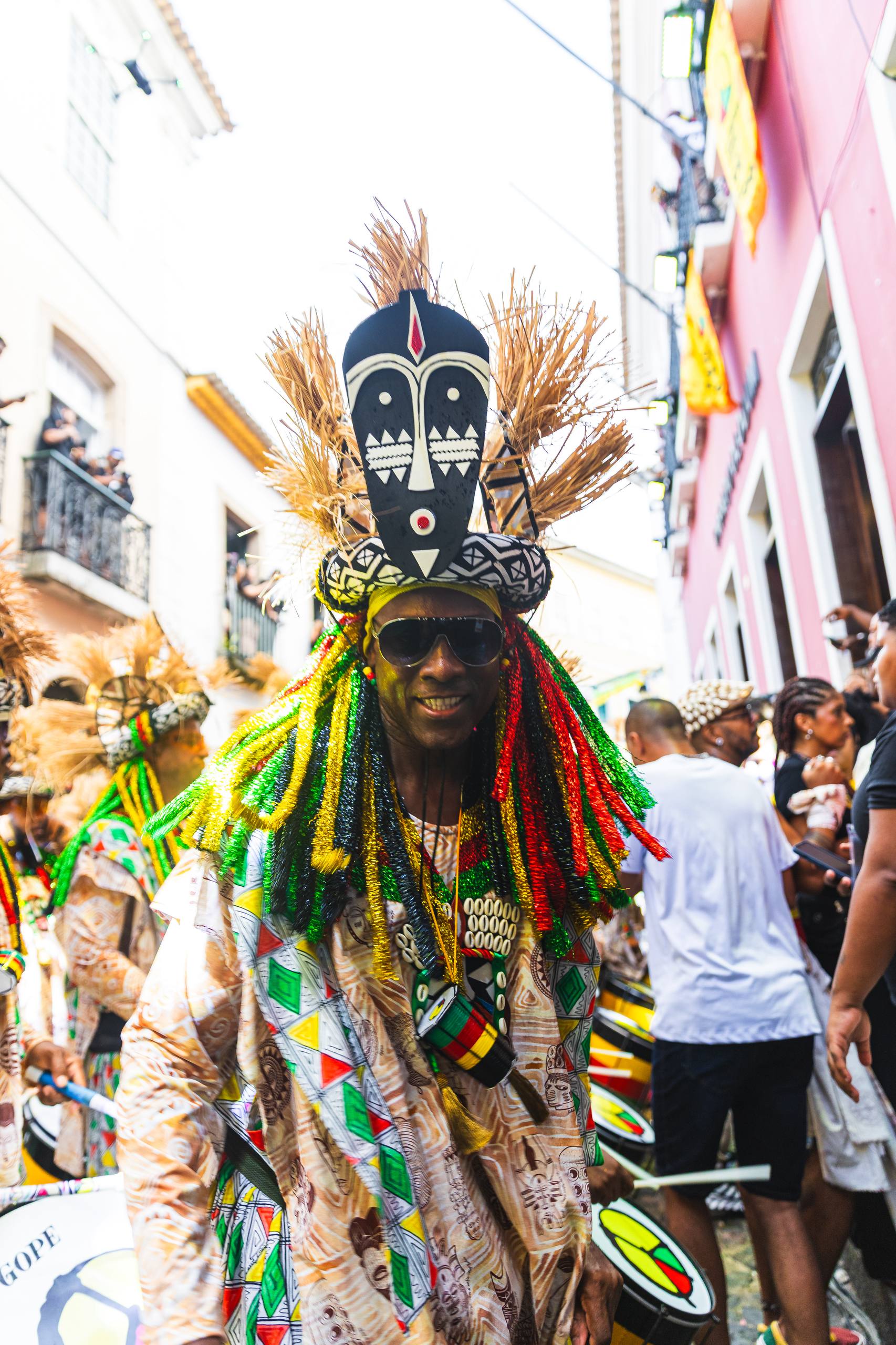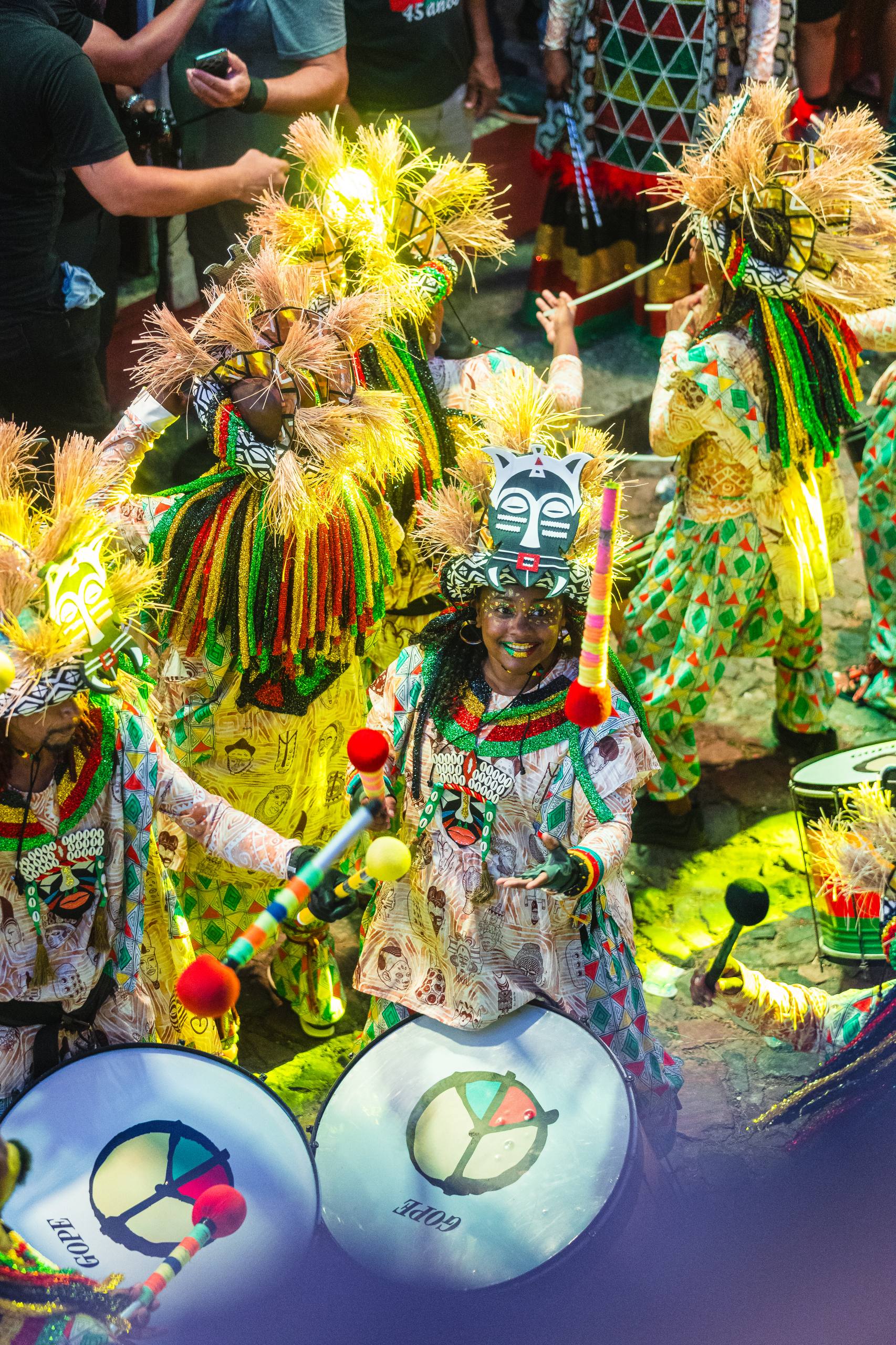 Beleza estonteante - Para além da música, o Olodum se apresentou para os foliões com uma ala de frente que remete aos Egunguns - espíritos ancestrais masculinos que retornam à terra para abençoar, aconselhar e proteger os vivos. O coreógrafo Wagner Santana, responsável pelo grupo de 40 dançarinos, desde 2024, disse que fez uma viagem cultural e religiosa ao Benin, a fim de mergulhar no conceito.