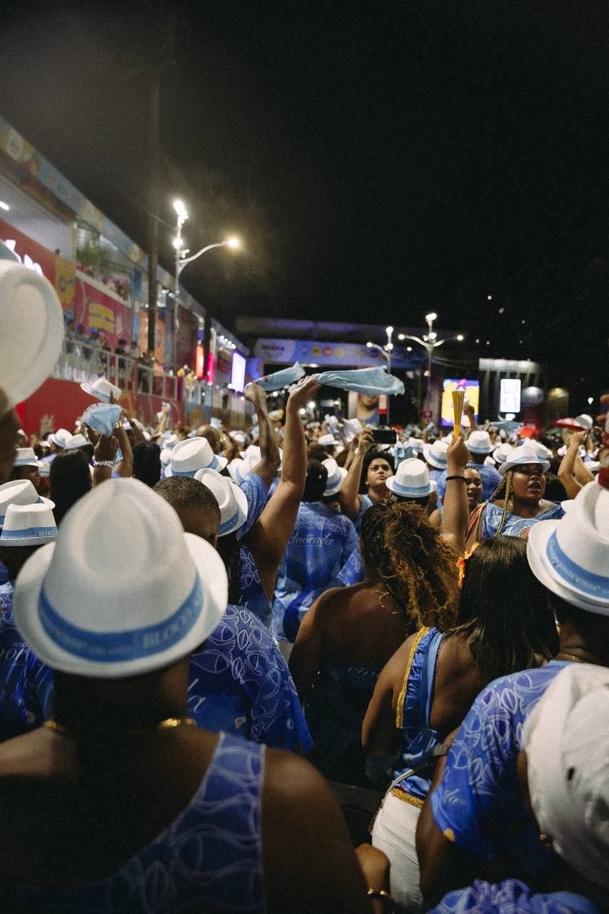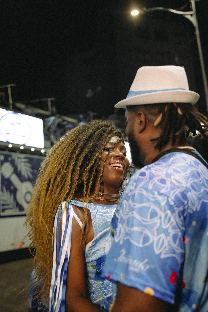 A velha guarda conduziu o desfile ao som dos instrumentos tradicionais do samba. Com camisas do bloco e chapéus vermelhos com fitas azuis, os integrantes reforçaram a identidade da agremiação. As baianas também marcaram presença, levando brilho e imponência ao cortejo e recebendo aplausos do público.