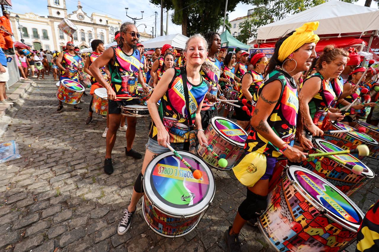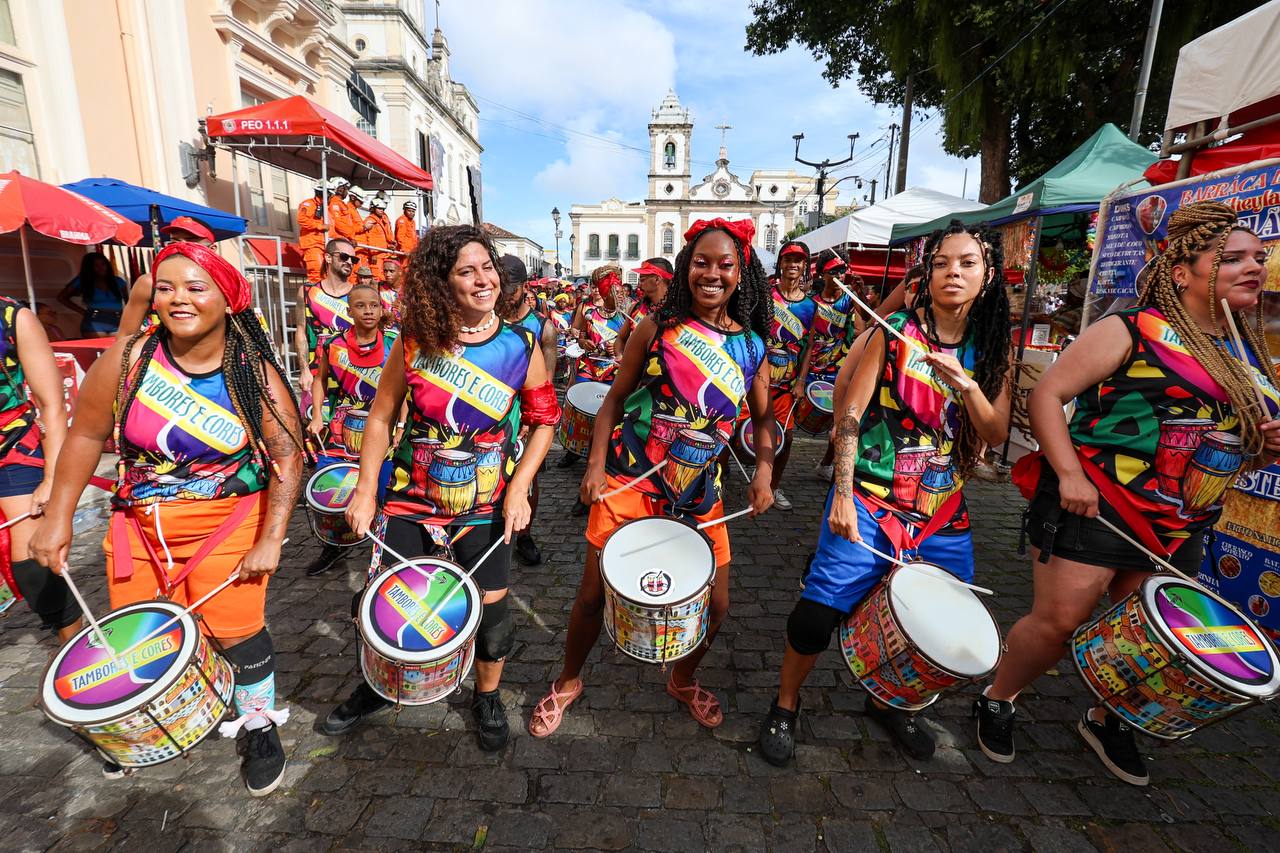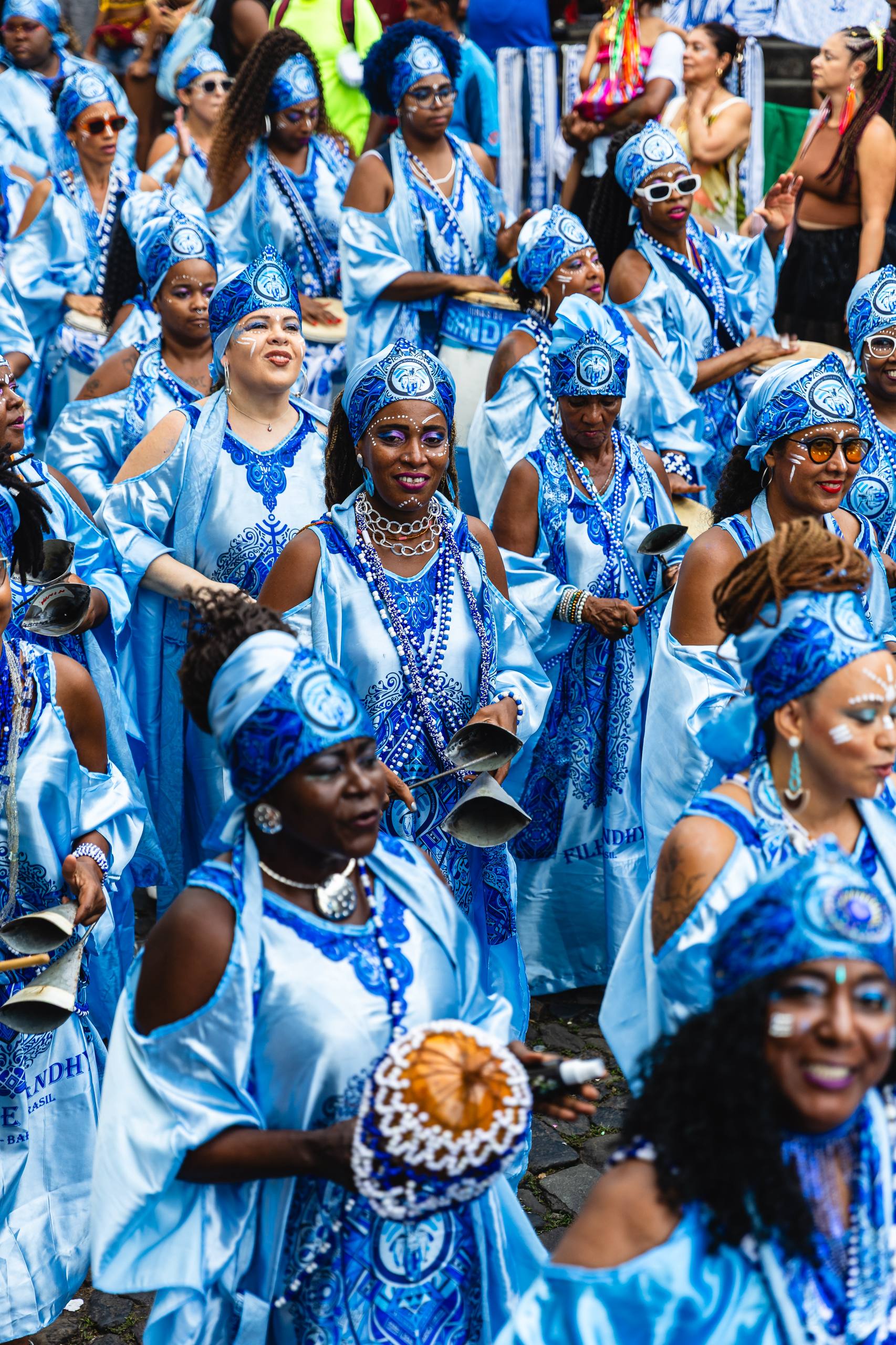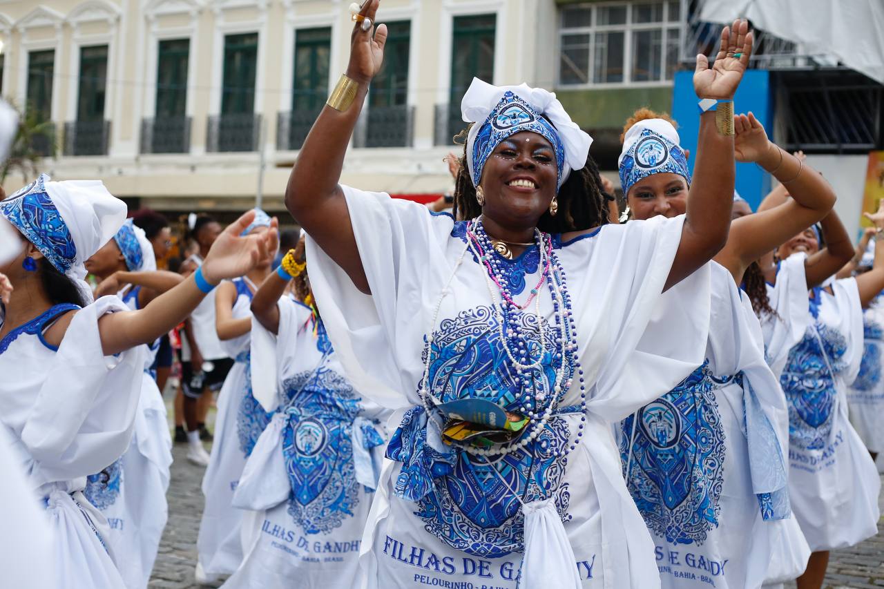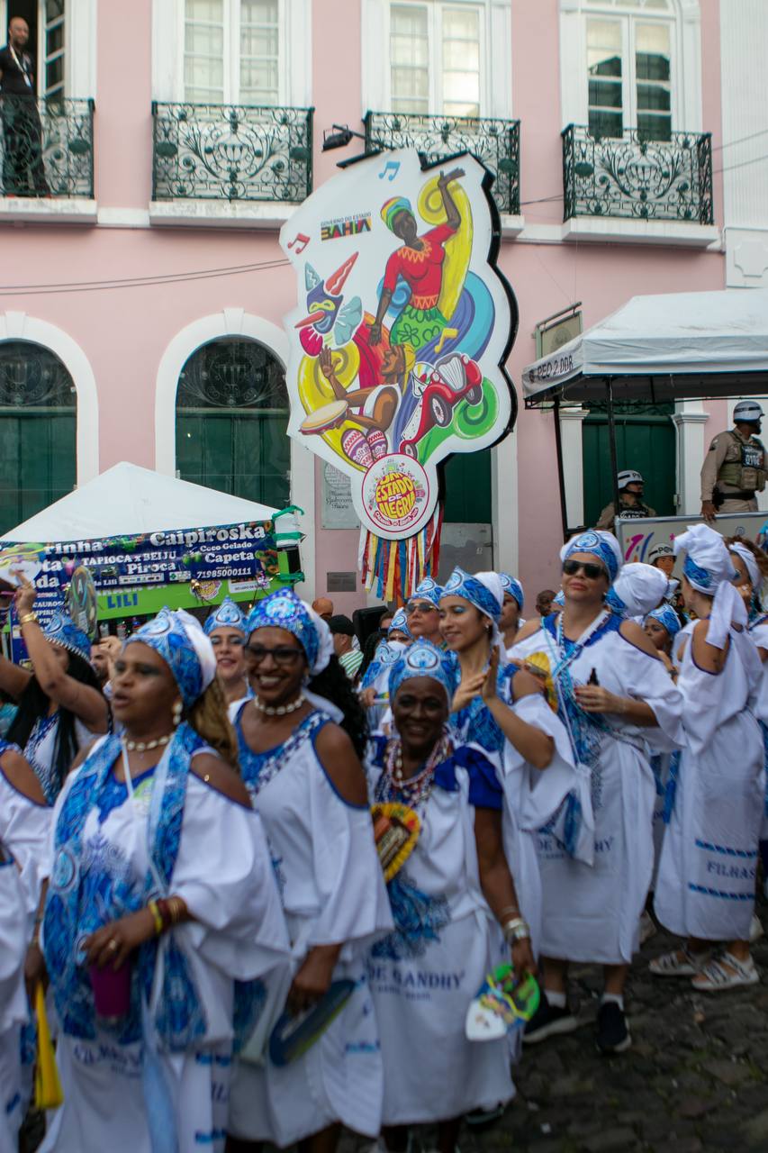 Na sequência, o destaque foi o afoxé Filhas de Gandhy, fundado em 1979 e reconhecido como o primeiro afoxé inteiramente feminino do Brasil. A passagem pelo Largo do Pelourinho começou ao som de instrumentos de sopro, chamando a atenção dos foliões. O desfile reuniu arte e história ao representar figuras simbólicas, espíritos ancestrais, povos originários e africanos, referências que seguem presentes nos valores do grupo. Personagens que evocam a mulher baiana, como xambá, caboclas e boiadeiras, também integraram a apresentação.
