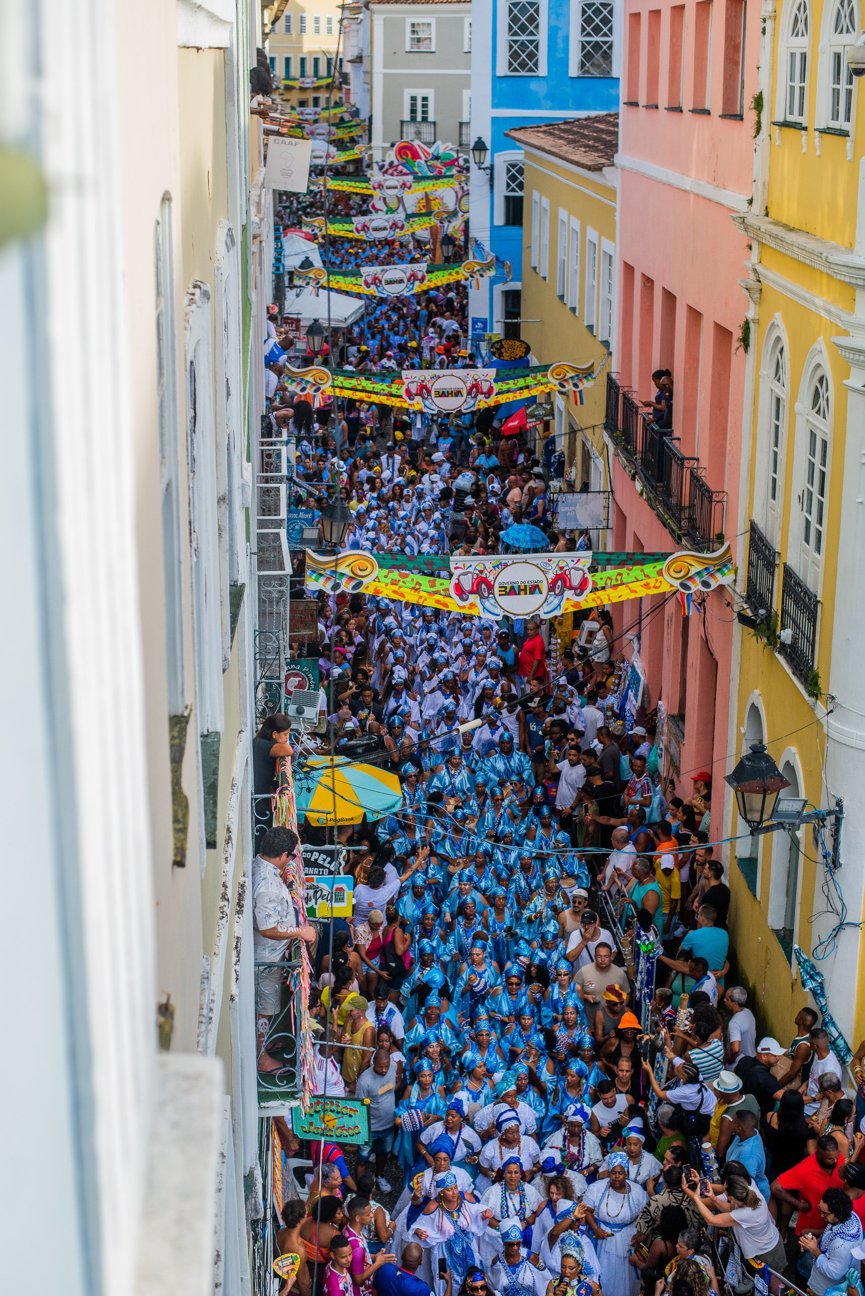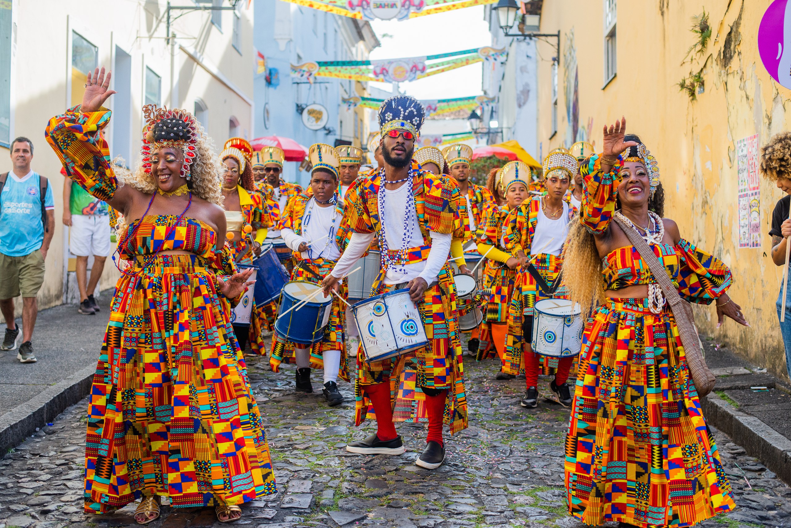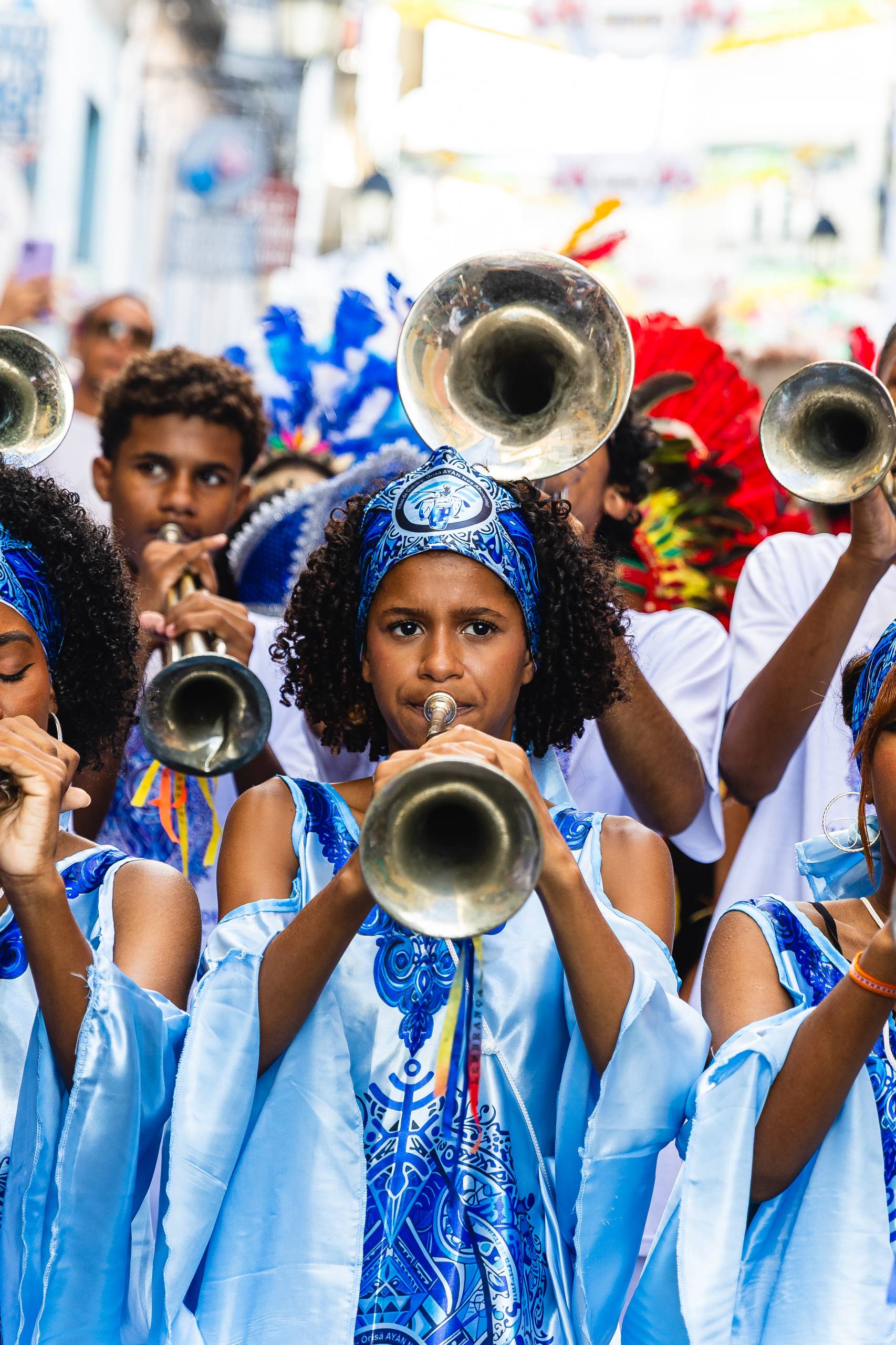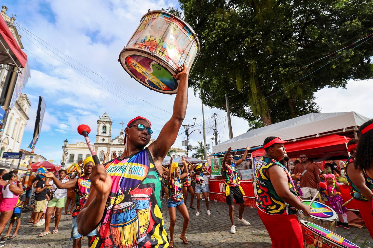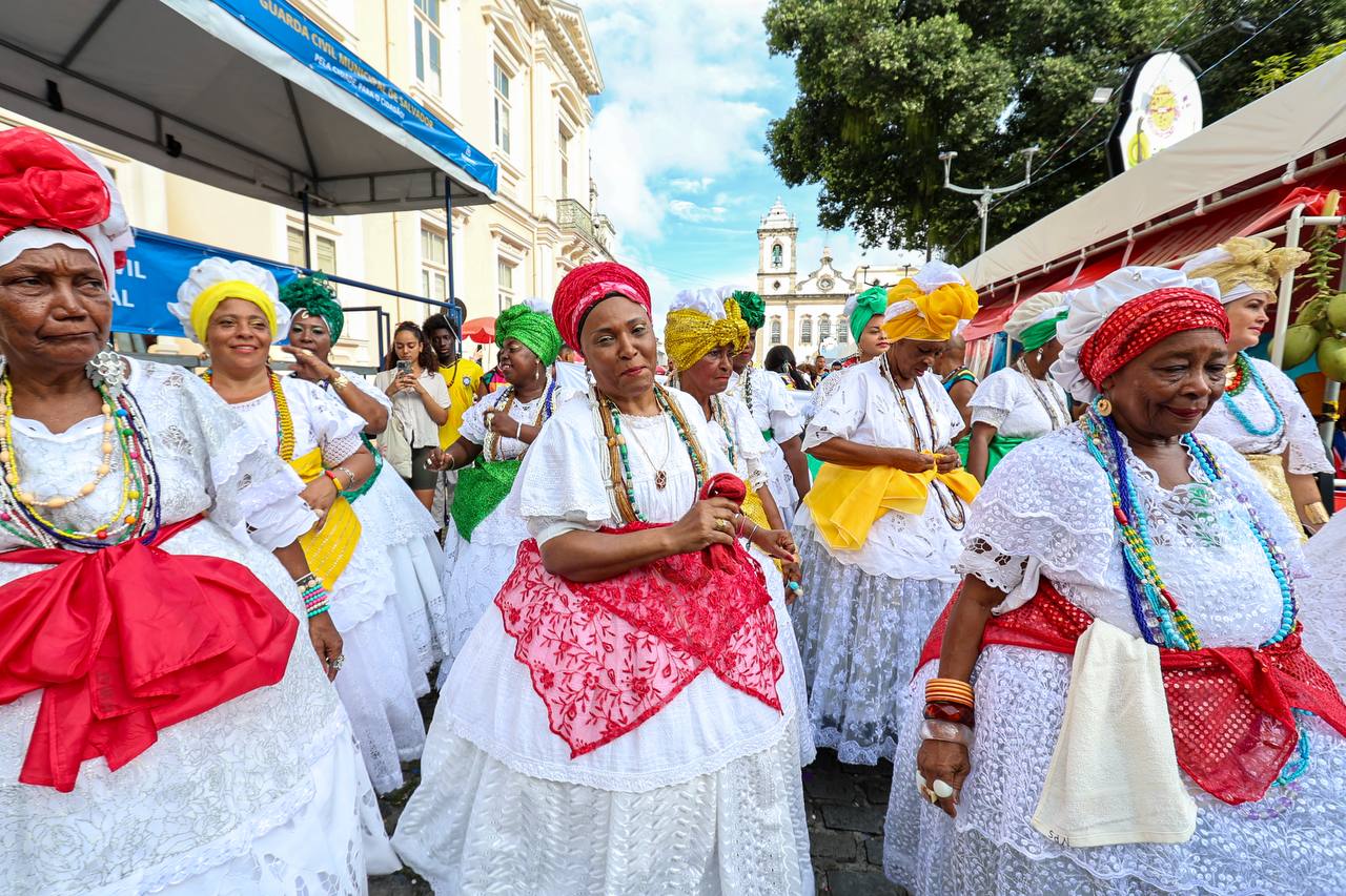 Na sequência, o destaque foi o afoxé Filhas de Gandhy, fundado em 1979 e reconhecido como o primeiro afoxé inteiramente feminino do Brasil. A passagem pelo Largo do Pelourinho começou ao som de instrumentos de sopro, chamando a atenção dos foliões. O desfile reuniu arte e história ao representar figuras simbólicas, espíritos ancestrais, povos originários e africanos, referências que seguem presentes nos valores do grupo. Personagens que evocam a mulher baiana, como xambá, caboclas e boiadeiras, também integraram a apresentação.
