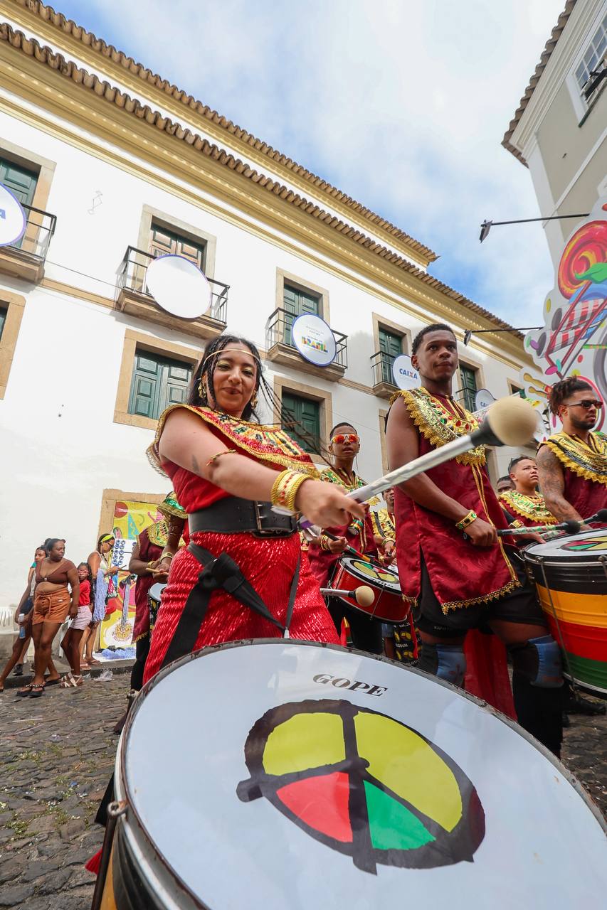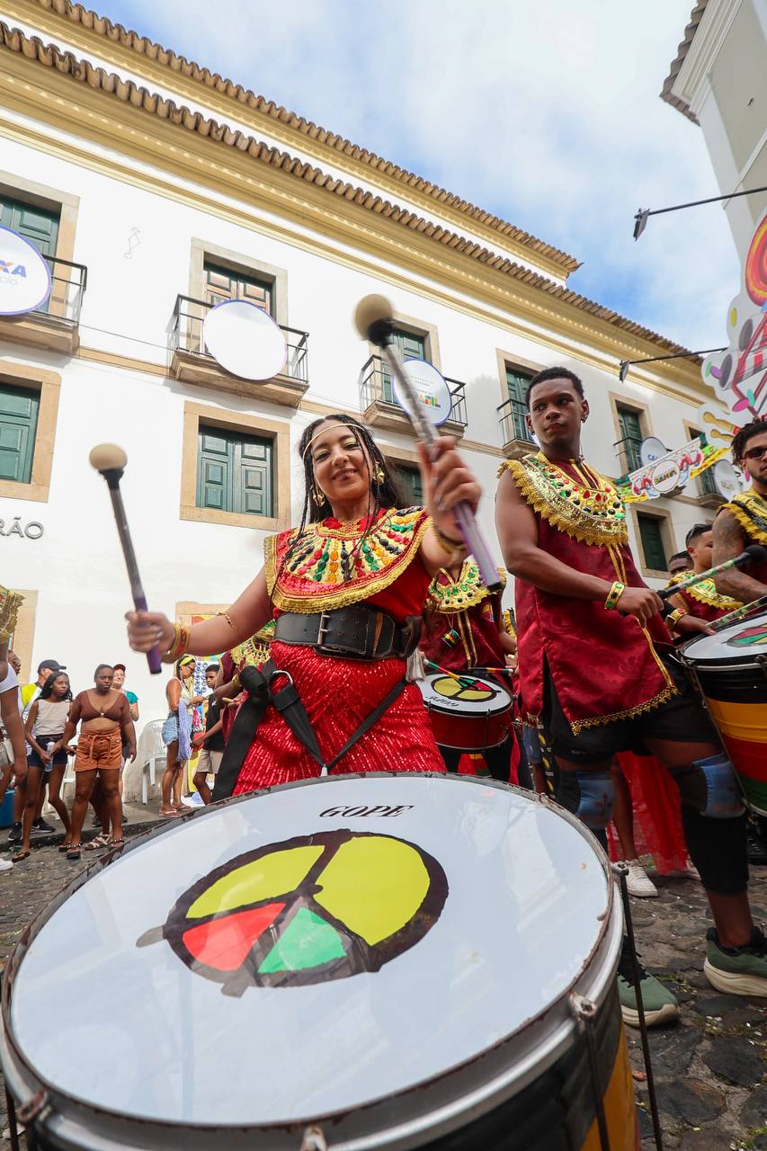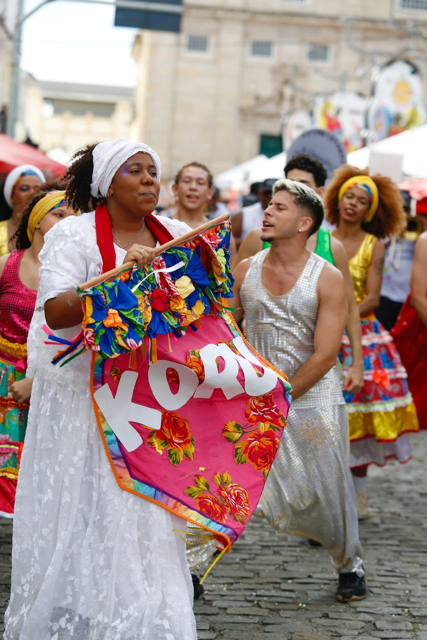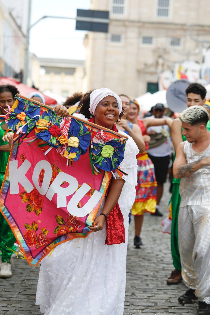 Fruto da Escola Olodum, o projeto existe desde 1991 focado na ancestralidade africana e no protagonismo juvenil. Ainda no quesito itinerância, a dobradinha da Orquestra Os Franciscanos com o Grupo de Dança Koru chamou a atenção dos foliões assim que iniciou seu desfile no Largo Terreiro de Jesus. Era literalmente um ambiente de brincadeira que envolvia famílias e artistas.