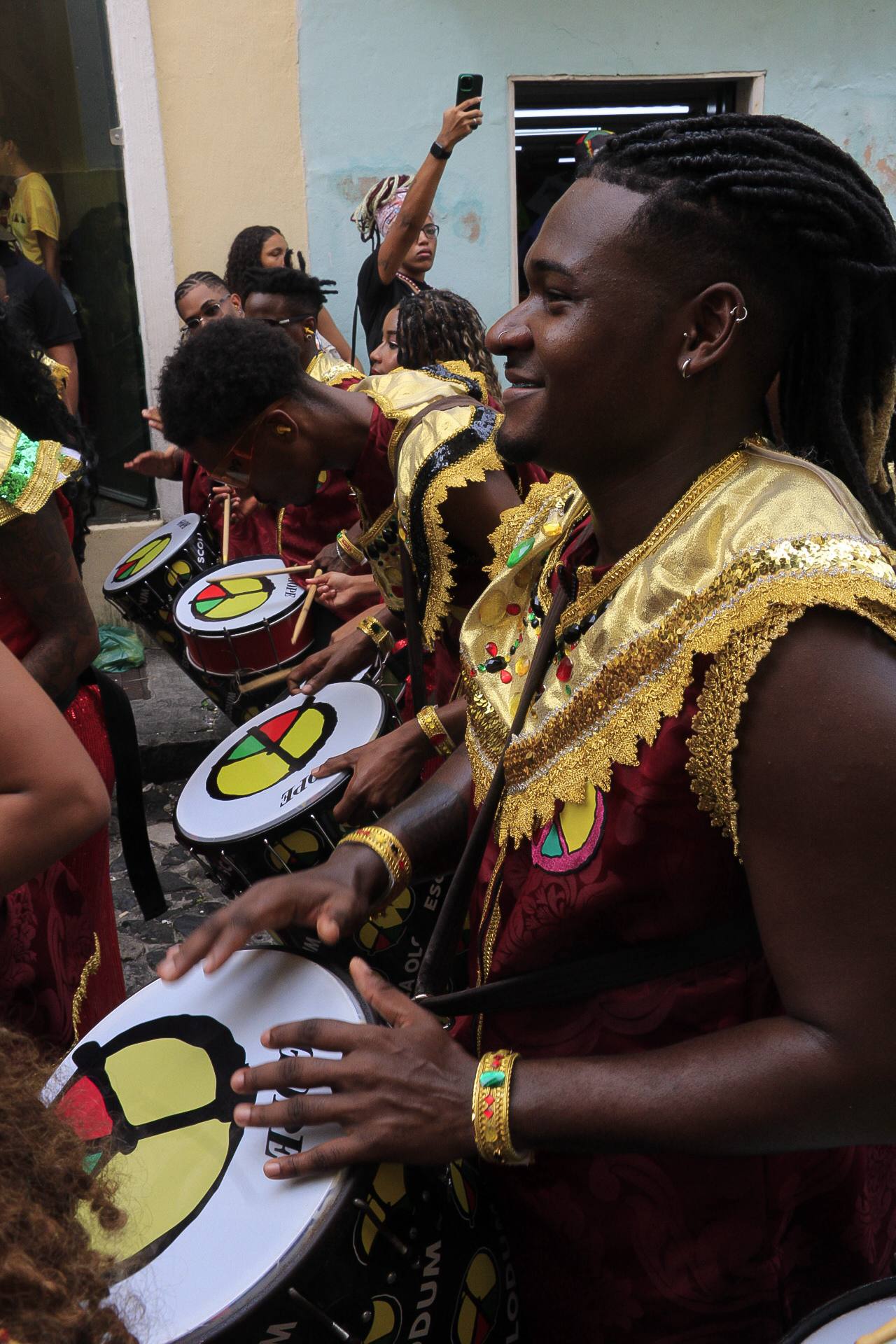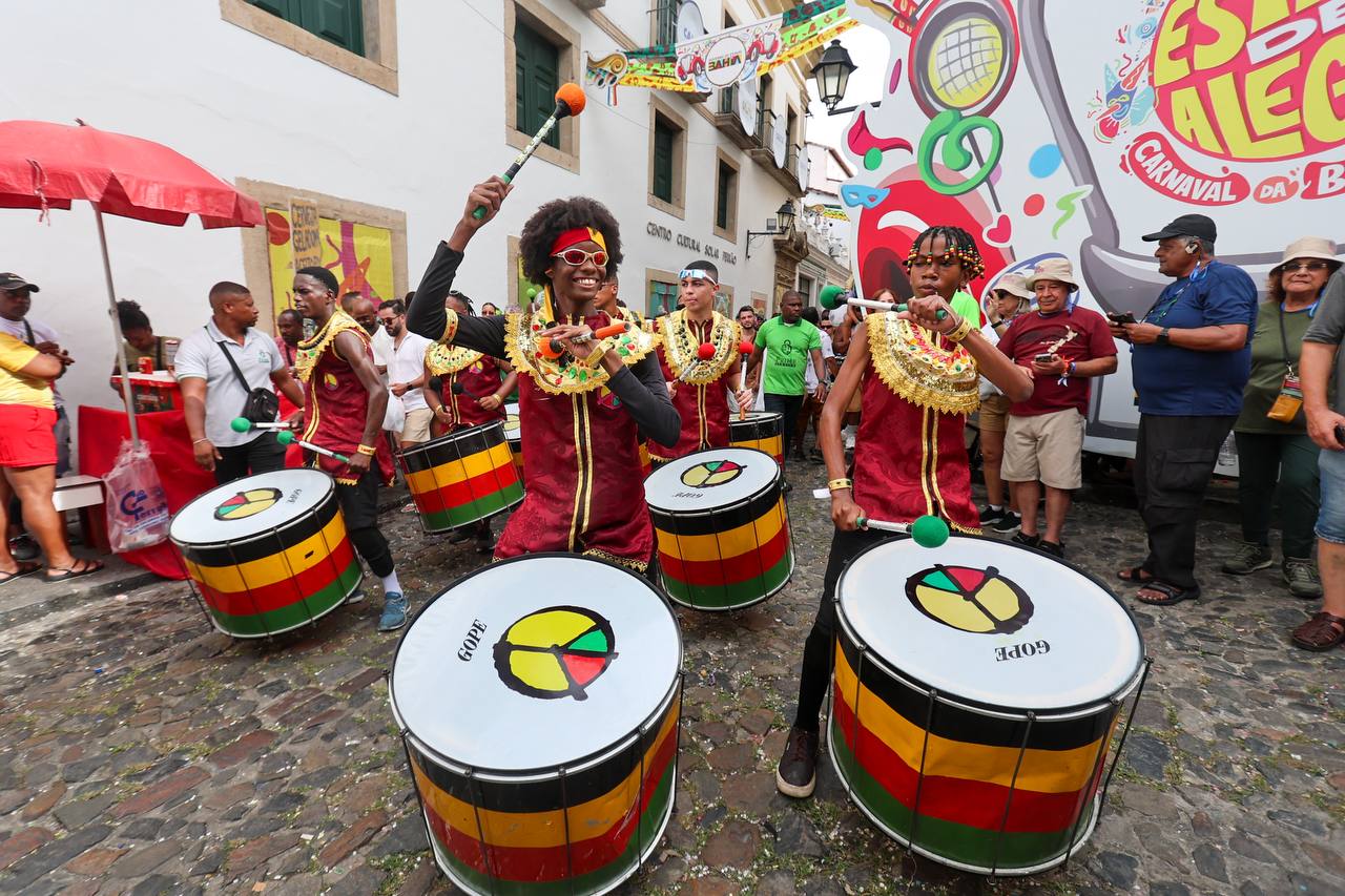 Na programação dos blocos itinerantes na tarde desta segunda-feira, o Olodum Mirim com seus tambores mágicos atraiu gente que estava dispersa nas vielas do Pelourinho. Como um encantamento, as pessoas foram surgindo e, em apenas alguns minutos, os pequenos grandes artistas se viram ovacionados e cercados por aparelhos de celular para registrar sua bela performance pelas ladeiras do Centro Histórico.