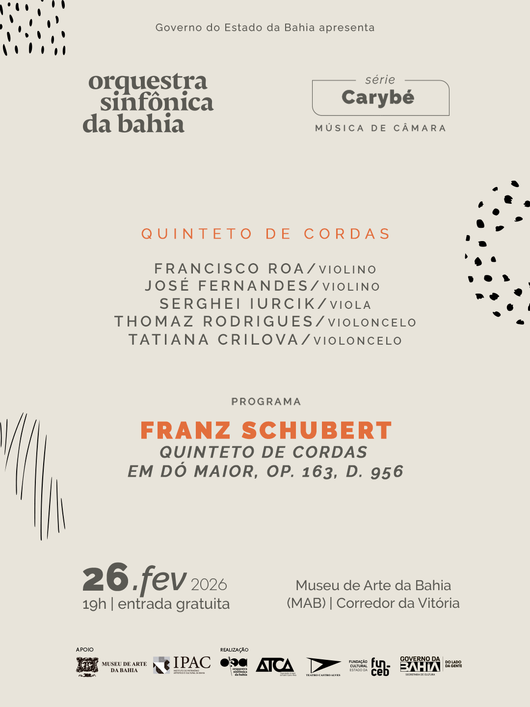 O programa traz o Quinteto de Cordas em Dó maior, D. 956 (Op. 163), do compositor austríaco Franz Schubert (1797-1828), uma das obras mais importantes da música de câmara. Nesta apresentação, o Quinteto de Cordas será formado pelos chefes de naipe da OSBA Francisco Roa e José Fernandes (violinos), Serghei Iurcik (viola) e Thomaz Rodrigues (violoncelo), além da violoncelista da Orquestra, Tatiana Crilova.