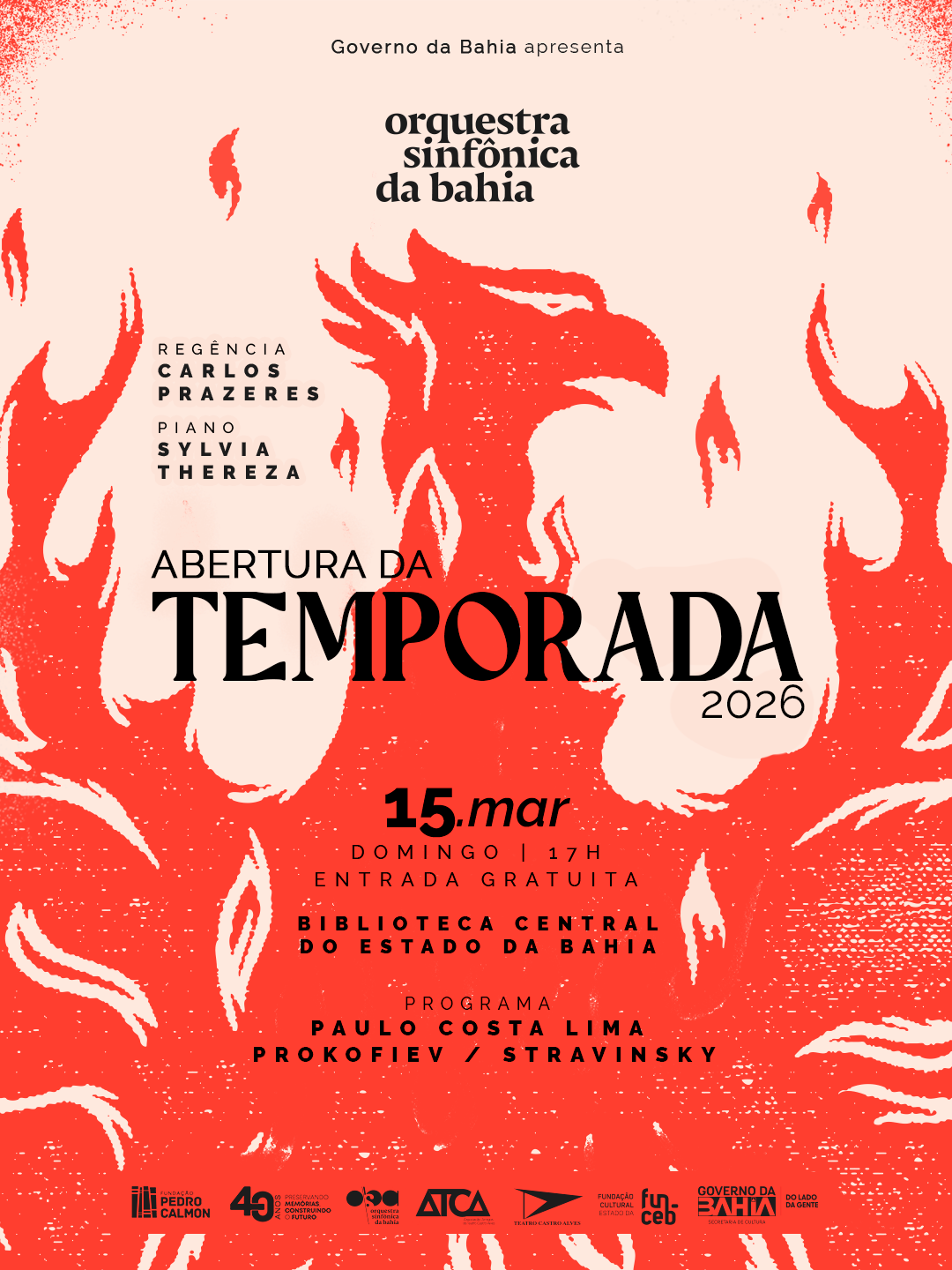 No segundo momento, Sylvia Thereza assume o palco para o solo no "Concerto para Piano nº 3 em Dó Maior, Op. 26" de Prokofiev, um dos concertos para piano mais tocados do século XX e uma espécie de prova de fogo para qualquer solista. Fechando o programa, a OSBA interpretará a Suíte de "O Pássaro de Fogo" (versão 1919), de Stravinsky, obra que, em sua versão original para balé (1910), revelou o compositor ao mundo e se tornou uma das páginas mais importantes do repertório orquestral do século XX. A suíte de 1919 condensa os momentos essenciais da partitura original.