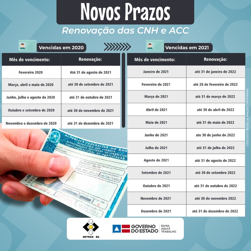 A portaria 230 do Contran estabeleceu que os portadores de CNH e de Autorização para Conduzir Ciclomotor (ACC) vencidas em março, abril e maio de 2020 têm até dia 30 de setembro deste ano para renovar suas habilitações. As vencidas em junho, julho e agosto do ano passado têm até dia 31 de outubro e assim sucessivamente, conforme a tabela que pode ser encontrada no site do Detran-BA ()