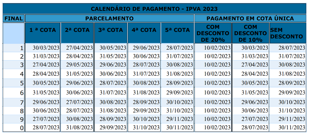 Os proprietários de veículos com placas finais 7 e 8 que optarem pela cota única têm até o dia 30 de outubro (final 7) e 31 de outubro (final 8) para o pagamento do imposto. Já em novembro, no dia 29, vence o prazo para quitar o IPVA das placas de final 9. Em seguida, no dia 30, para aquelas de final 0.