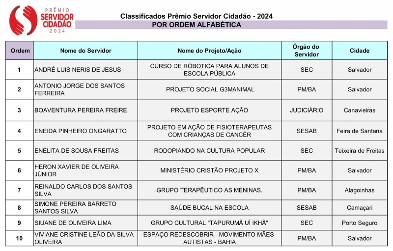 A Comissão Especial de Seleção e Julgamento do Prêmio Servidor Cidadão divulgou a relação dos seus 10 finalistas. Três são da Secretaria da Educação do Estado: André Luis Neris de Jesus, com o projeto "Curso de Robótica para Alunos de Escola Púbica"; Enelita de Sousa Freitas, com o projeto "Rodopiando na Cultura Popular"; e Siuane de Oliveira Lima, com o projeto "Grupo Cultural 'Tapurumã Uí Ikhã"; A ordem dos vencedores será conhecida na cerimônia de premiação. Por enquanto, o nome dos finalistas aparece em ordem alfabética e não de classificação, na página da premiação disponível no Portal RH Bahia (https://servidores.rhbahia.ba.gov.br/premio-servidor-cidadao). O evento será realizado no dia 24 de outubro, às 14h30, no auditório Zezéu Ribeiro, no antigo prédio da Flem (atual Seap), no Centro Administrativo da Bahia (CAB), com a presença do secretário da Administração, Edelvino Góes.
