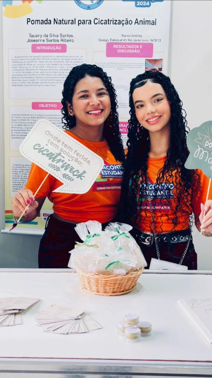 No município de Rio do Antônio, pertencente ao Território de Identidade do Sertão Produtivo (NTE 13), as estudantes Tauany da Silva Santos e Joseanne Santos Ribeiro, ambas de 16 anos, do Colégio Estadual de Tempo Integral de Rio do Antônio, deram vida ao projeto “Cicatriveck” -- uma pomada cicatrizante 100% natural feita a partir da folha de mandioca. Movidas pela necessidade de oferecer uma solução acessível aos pequenos criadores da região, elas reuniram ciência, sustentabilidade e saberes tradicionais para acelerar a cicatrização de feridas em animais e reduzir o uso de antibióticos sintéticos.