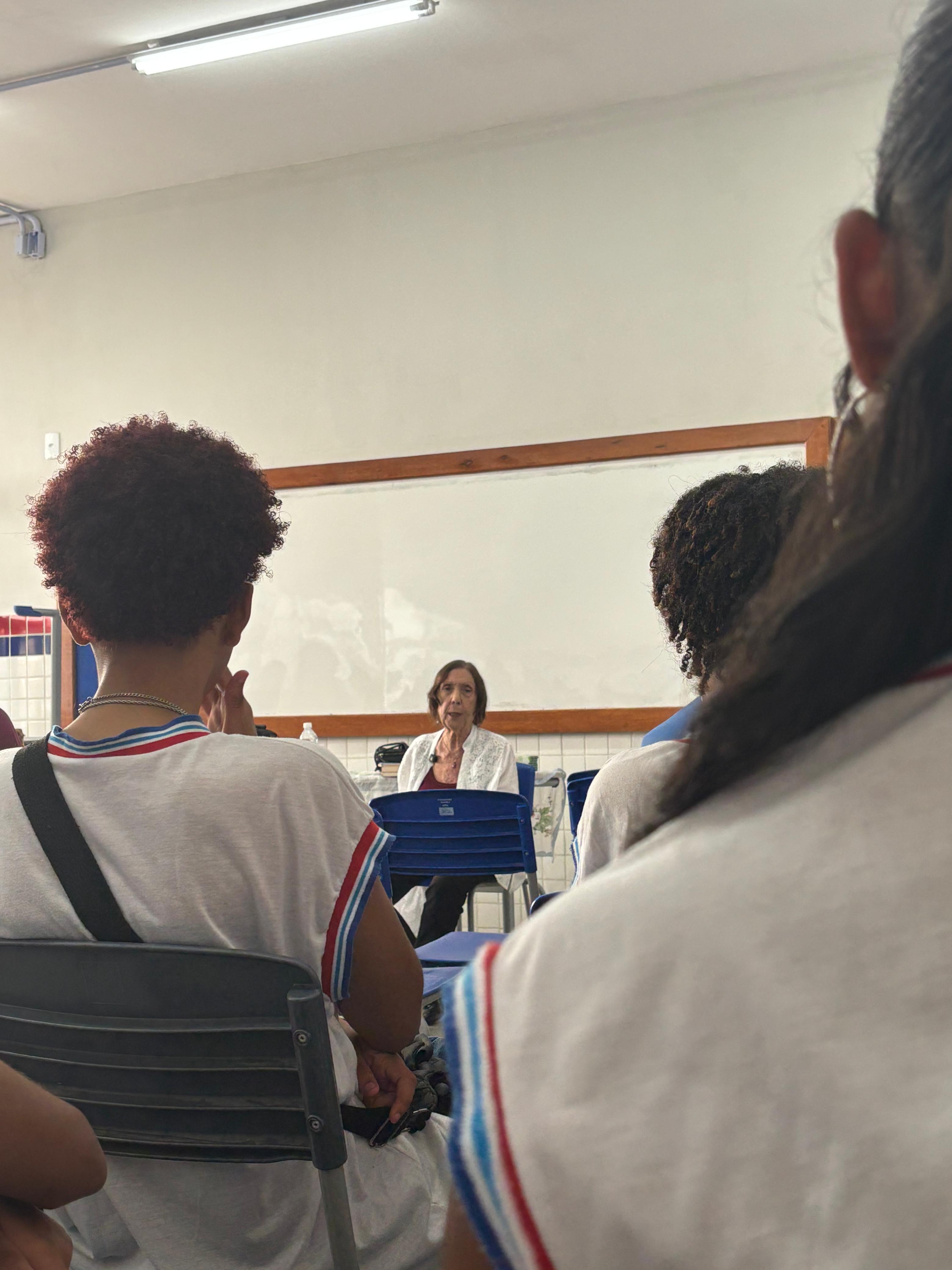 Estudantes do Colégio Estadual Manuel Devoto, em Salvador, participaram, na tarde desta quinta-feira (18), de uma roda de conversa com a socióloga e ex-presa política Eliana Rollenberg. A atividade integra o Projeto Pinta Passado Cria Futuro, que mobiliza a comunidade escolar para refletir sobre democracia, memória e direitos humanos. A proposta reúne professores da instituição, pesquisadores da Universidade Federal da Bahia (UFBA) e artistas visuais.