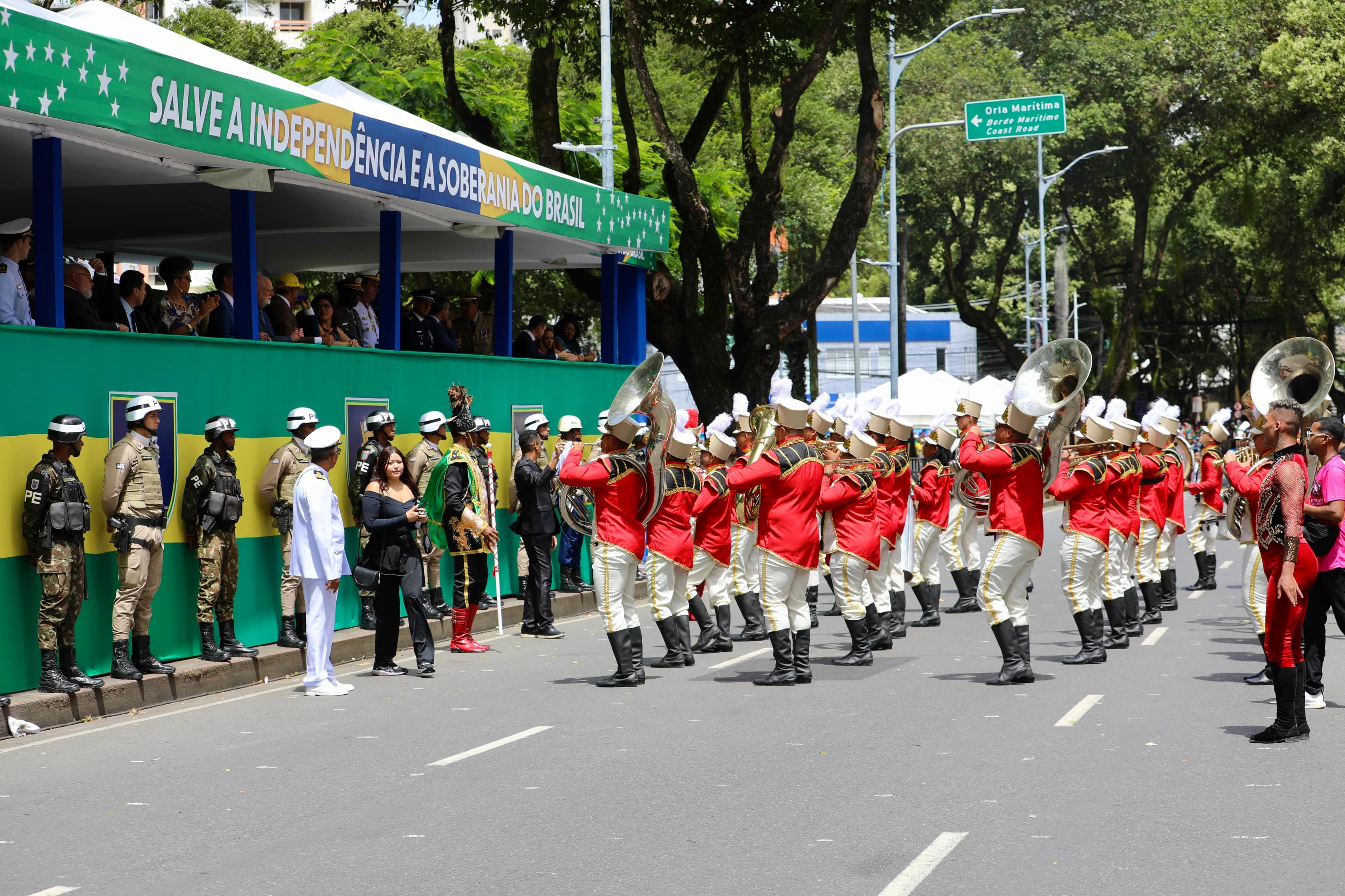 As comemorações, que foram iniciadas no Corredor da Vitória com o hasteamento das bandeiras, contou com a presença de diversas autoridades, entre as quais o governador Jerônimo Rodrigues, que presidiu o ato cívico-militar, e a secretária estadual da Educação, Rowenna Brito, além de representantes da Marinha do Brasil, que este ano assumiu a coordenação geral da programação, do Exército Brasileiro, da Força Aérea, do Corpo de Bombeiros Militar da Bahia e da Polícia Civil, entre outros. A passagem das fanfarras escolares no local foi um dos momentos especiais do desfile.