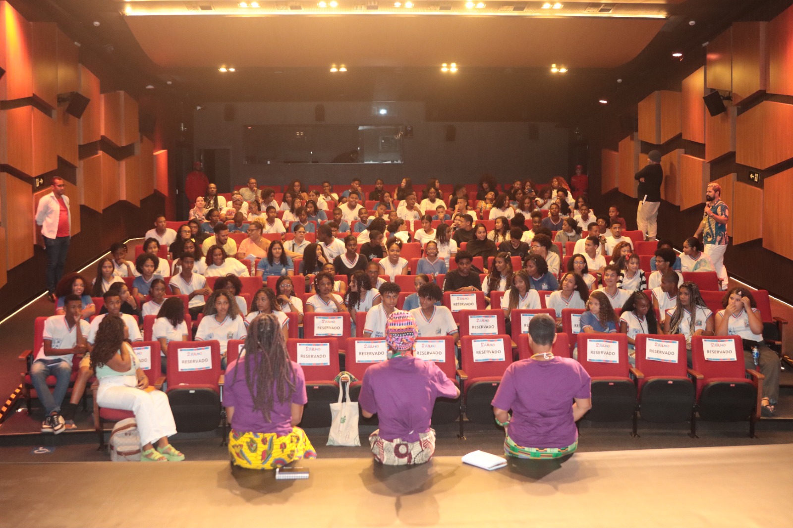 Cerca de 150 estudantes da rede estadual tiveram, nesta quinta-feira (18), a experiência de conhecer um pouco da cinematografia africana contemporânea. Com a exibição do filme Wallay (produção realizada em Burkina Faso), no Cine Teatro 2 de Julho, os jovens, que também participaram de um bate-papo, puderam ampliar o repertório cultural, incentivados pela valorização do cinema enquanto espaço de formação crítica, social e cidadã.
