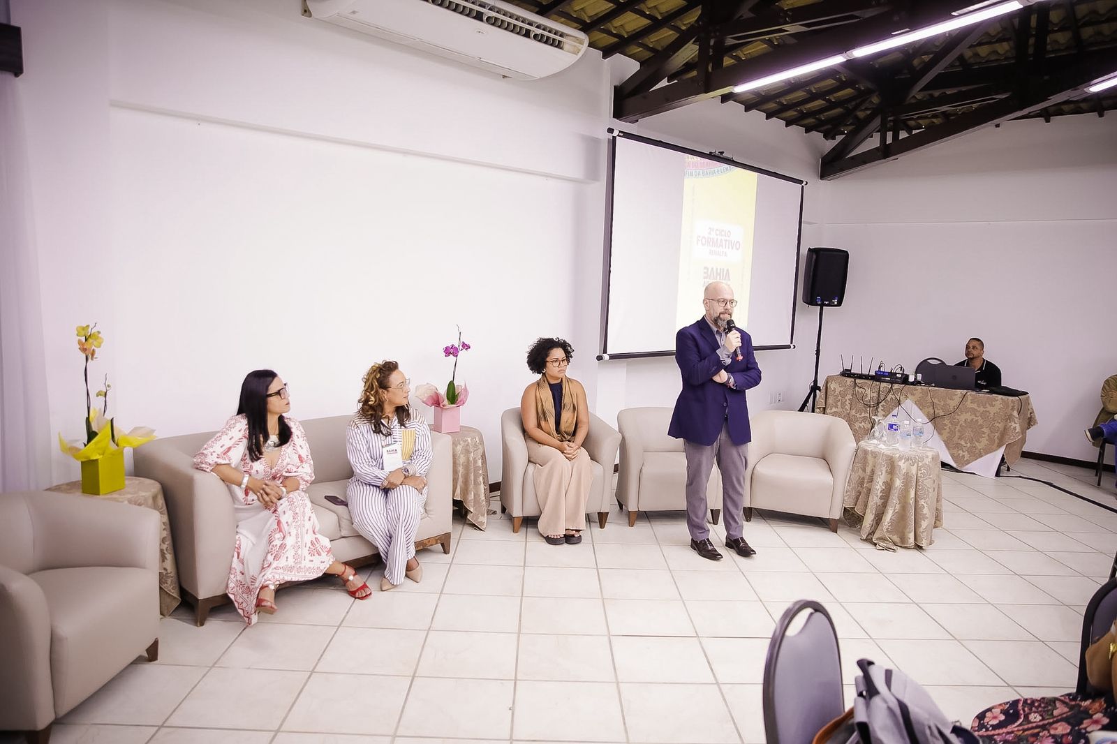 O assessor especial da SEC, Manoel Calazans, participou da mesa “Educação infantil e ciclo de alfabetização: transição, continuidades e formação docente“. Segundo o gestor, este é um evento que traz os articuladores de alfabetização dos territórios. "São pessoas estratégicas neste movimento em prol da alfabetização da criança na idade adequada", disse o assessor, que falou sobre a transição entre a Educação Infantil e o Ensino Fundamental; as características da Educação Infantil; e como ela pode contribuir para o processo de alfabetização.